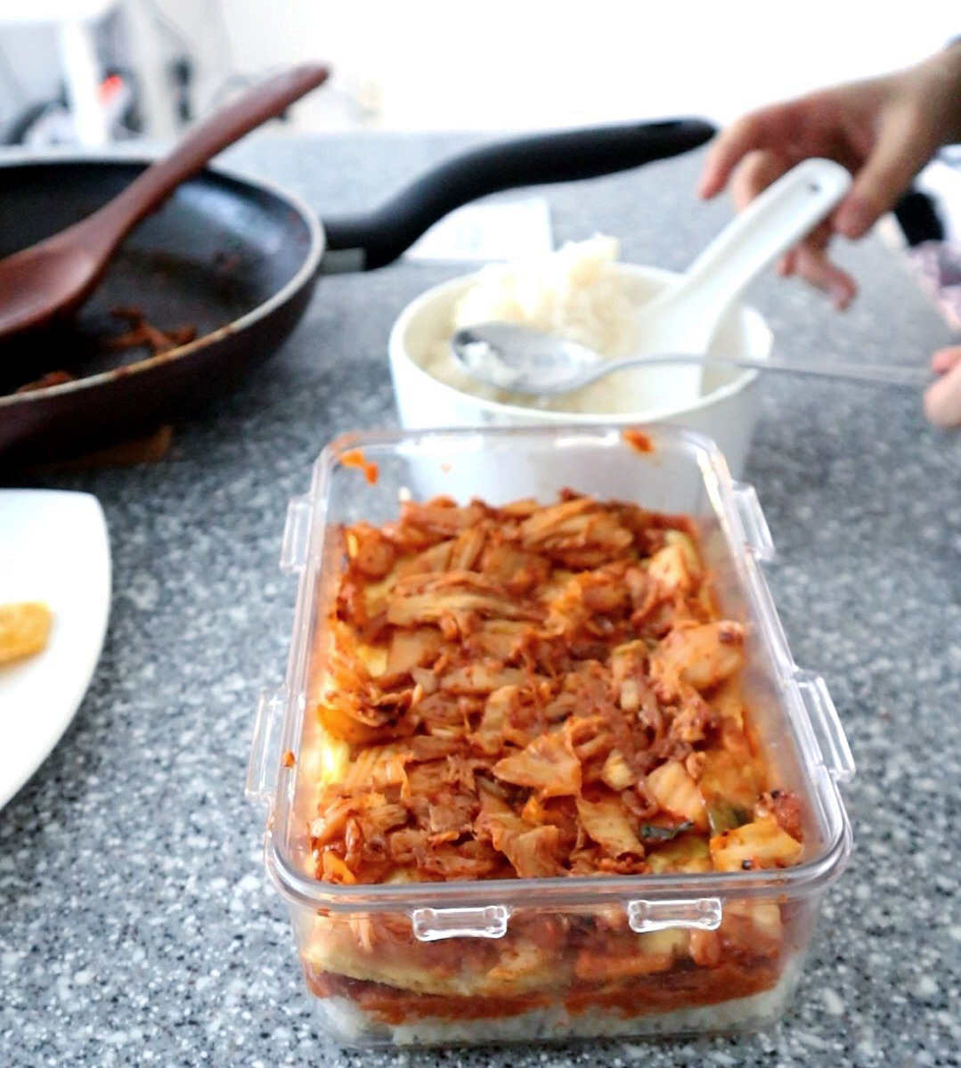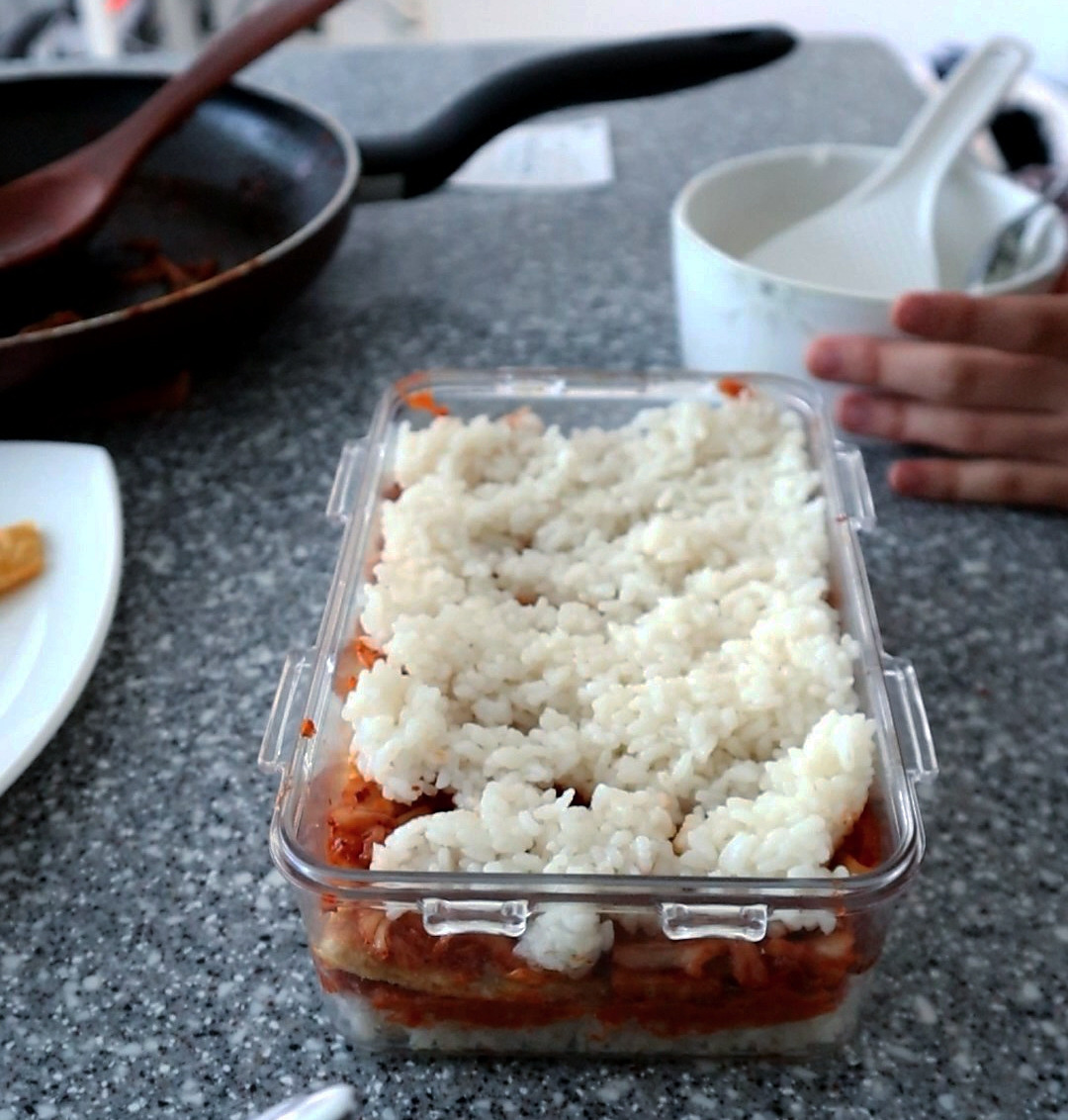 재료 준비 : 배추김치, 참치 캔 1개, 계란 4개, 밥, 고추장, 소금, 설탕, 식용유, 참기름, 사각형 반찬 통