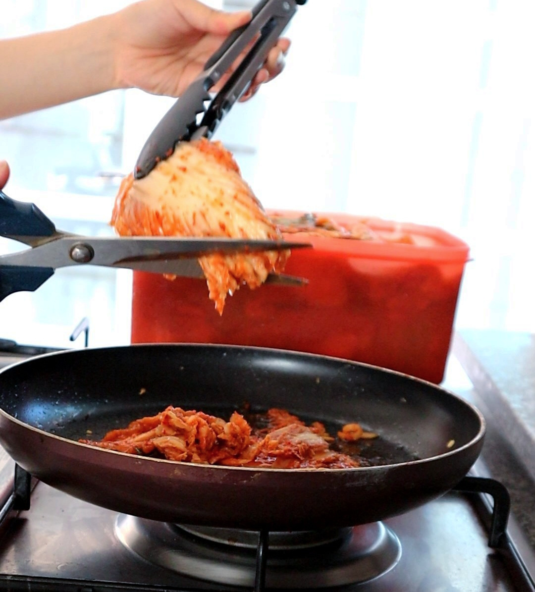 우선 나는 설거지를 줄이기 위해서 김치를 바로 프라이팬 위에서 잘라서 프라이팬에 투하시켰다.
