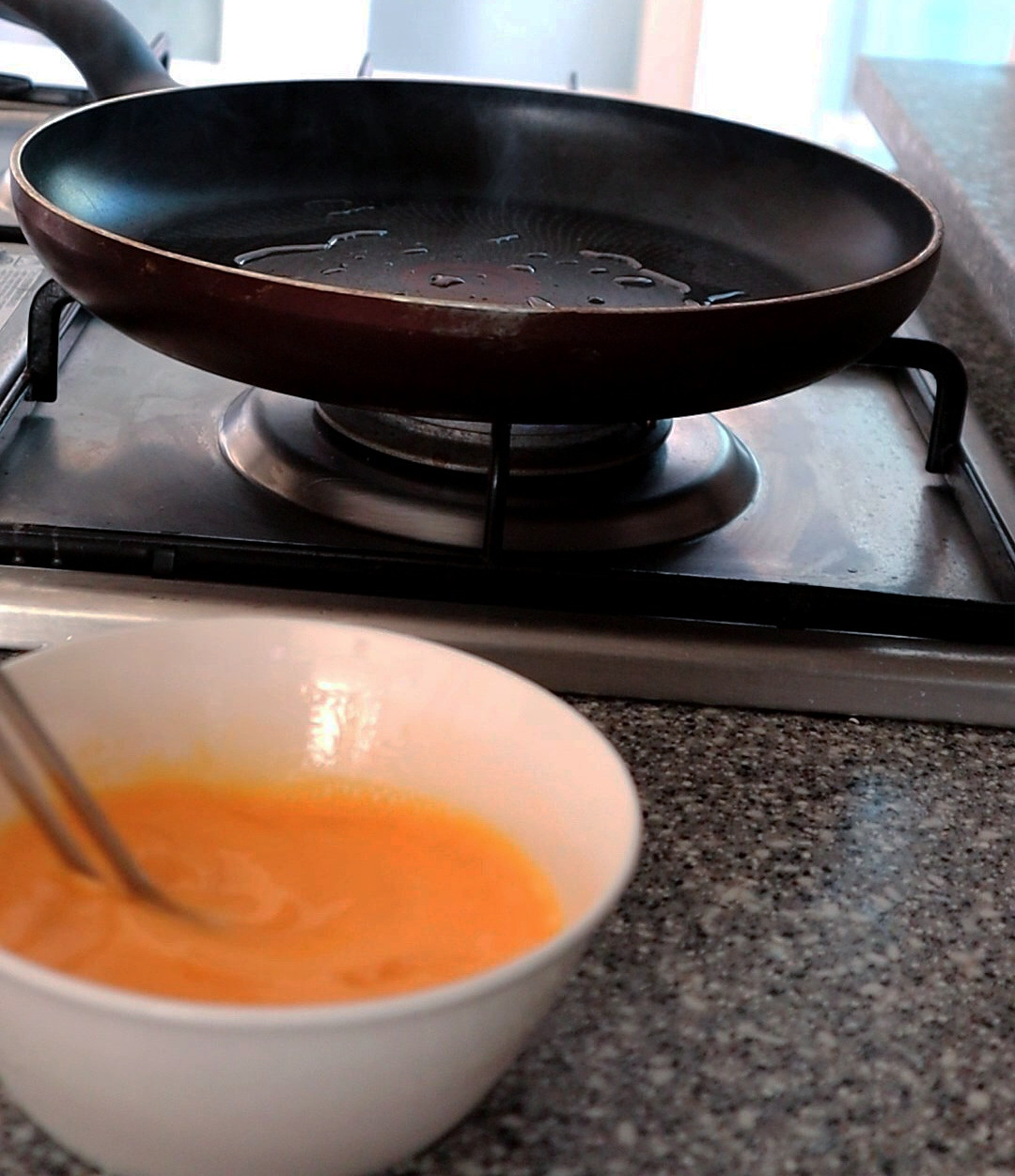 3-3. 프라이팬에 식용유를 한번 두르고 잘 섞인 계란물을 붓고 앞뒤로 잘 구워준다.