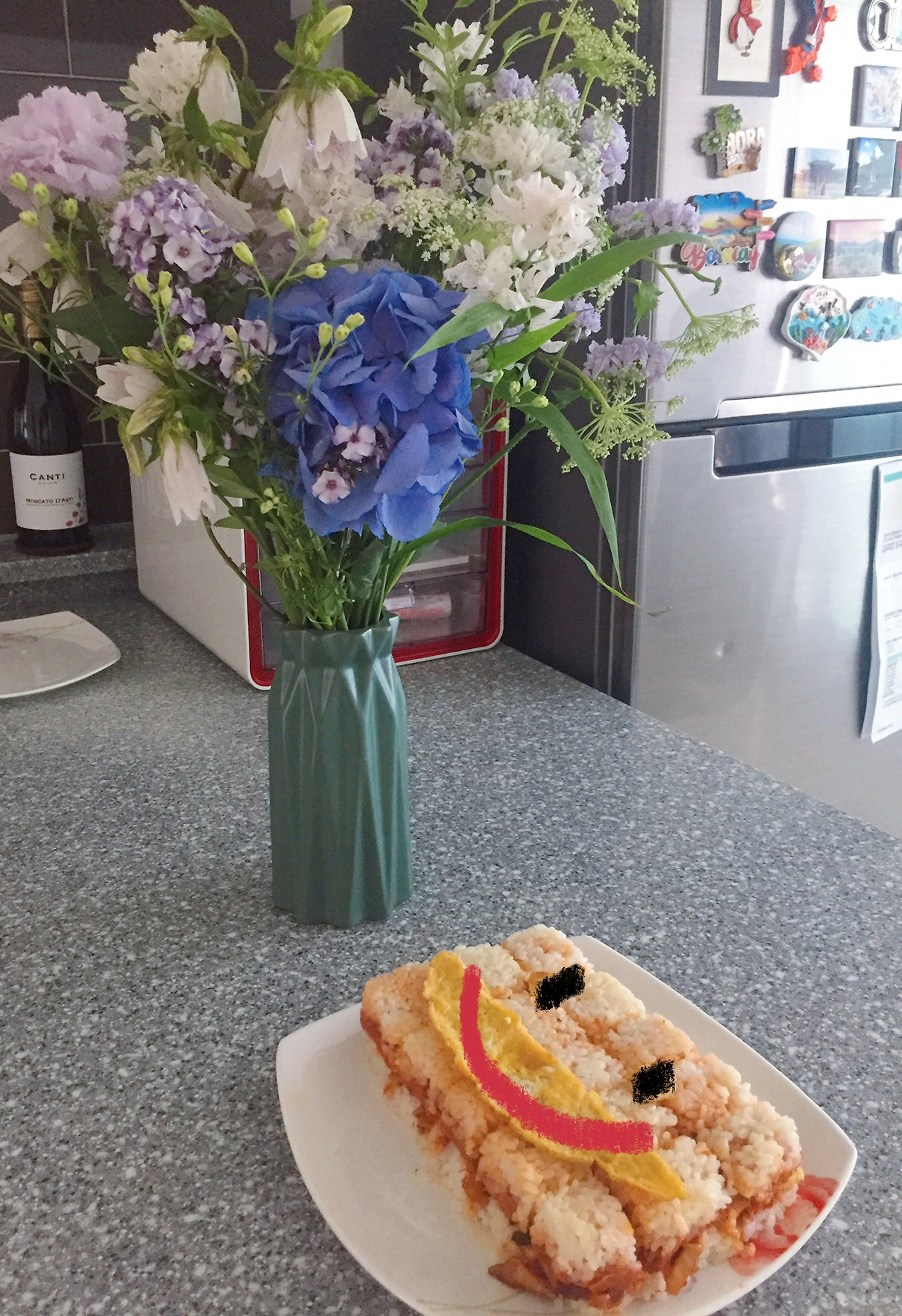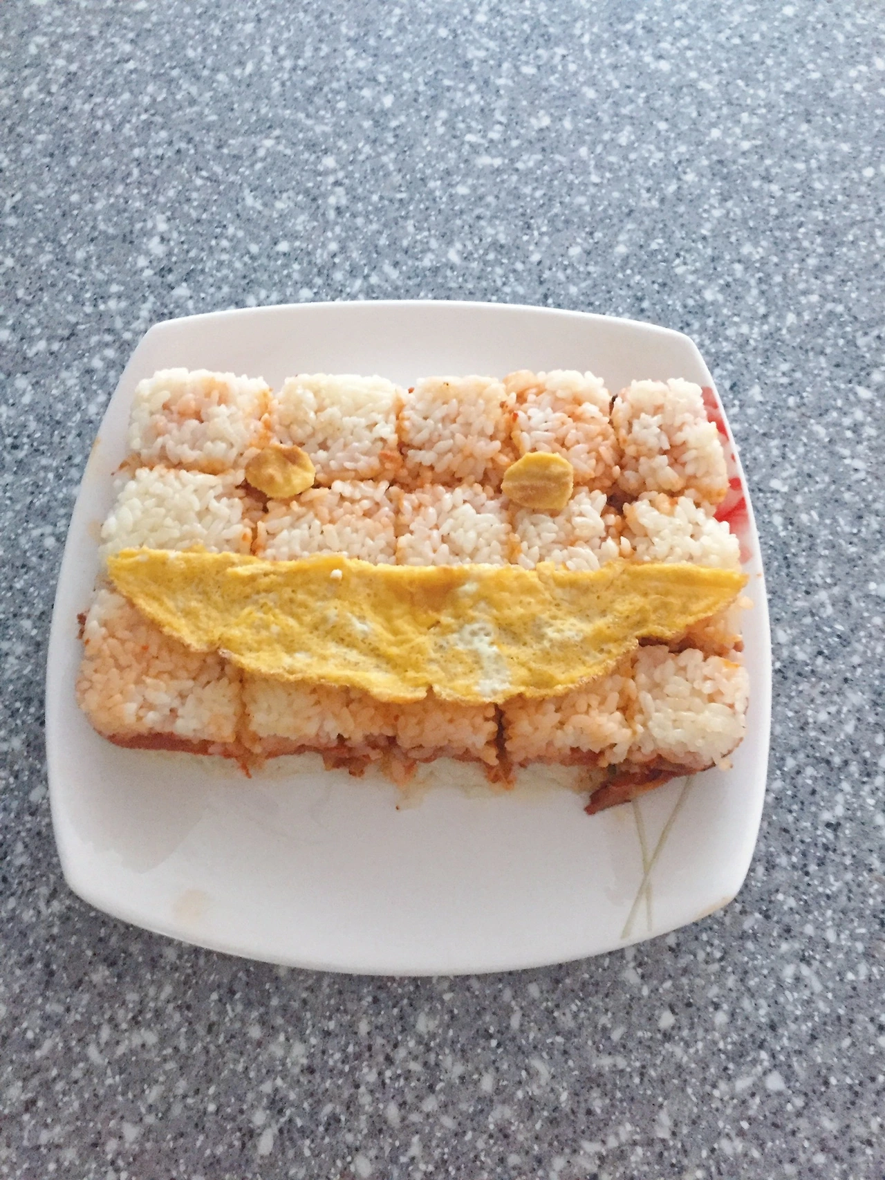남은 달걀지단으로 들쑥 날쑥한 크기의 모양을 가리기 위해 표정을 만들어 주었다.
