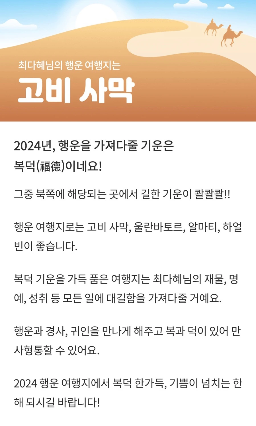 그러다 내가 ‘사주 앱에서 고비사막가면 나 운수 대통이래!’ 라고 했더니, 빠른 실행력으로 우리의 여행지는 몽골로 결정되었다.