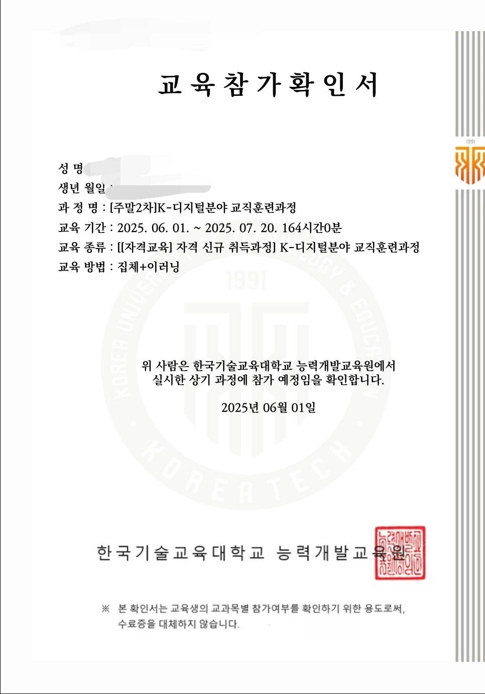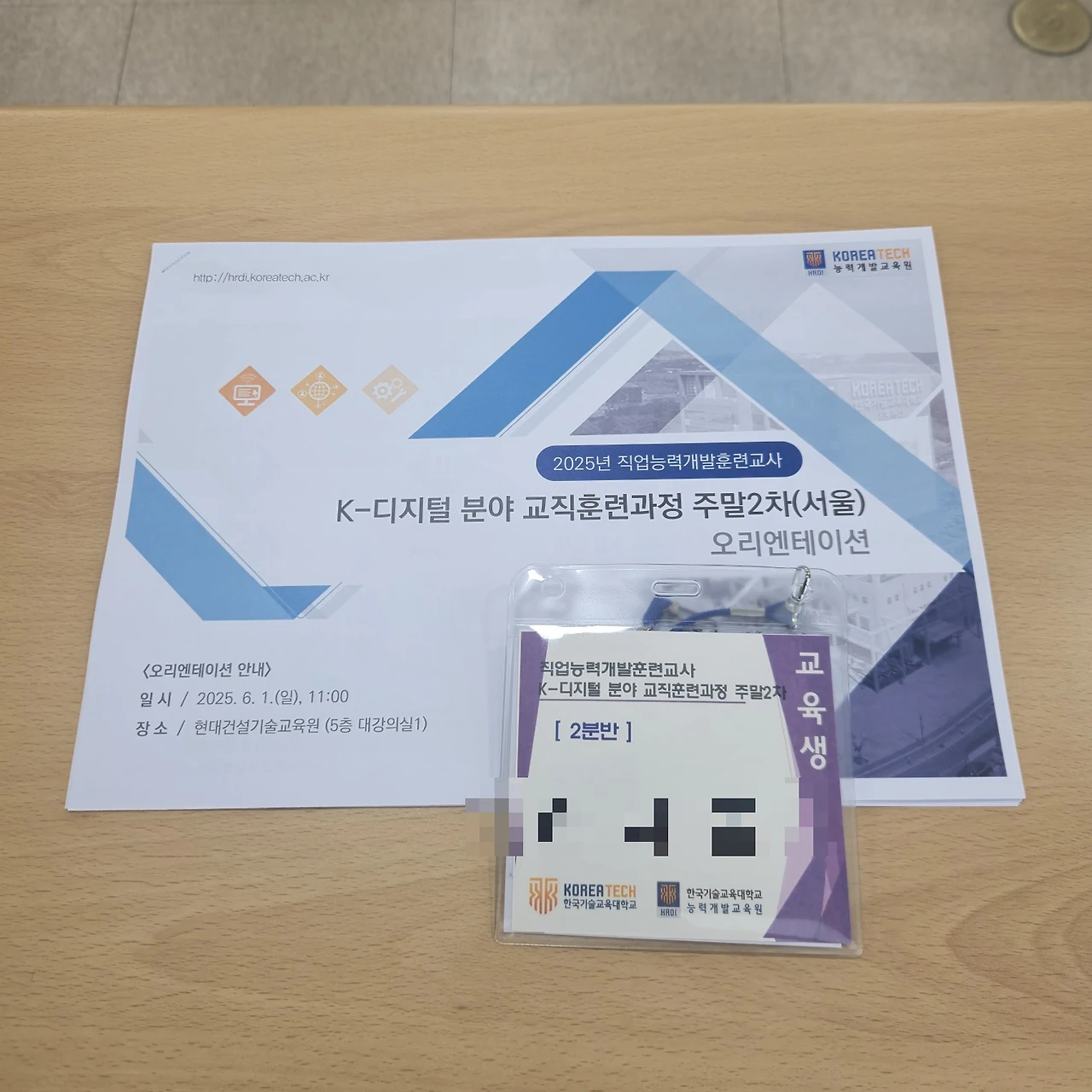 나는 현재 K - 디지털분야 교직훈련과정 2차(서울)에 선정되었다. 2025년 6월 1일부터 7월 20일 주말반 과정이다.