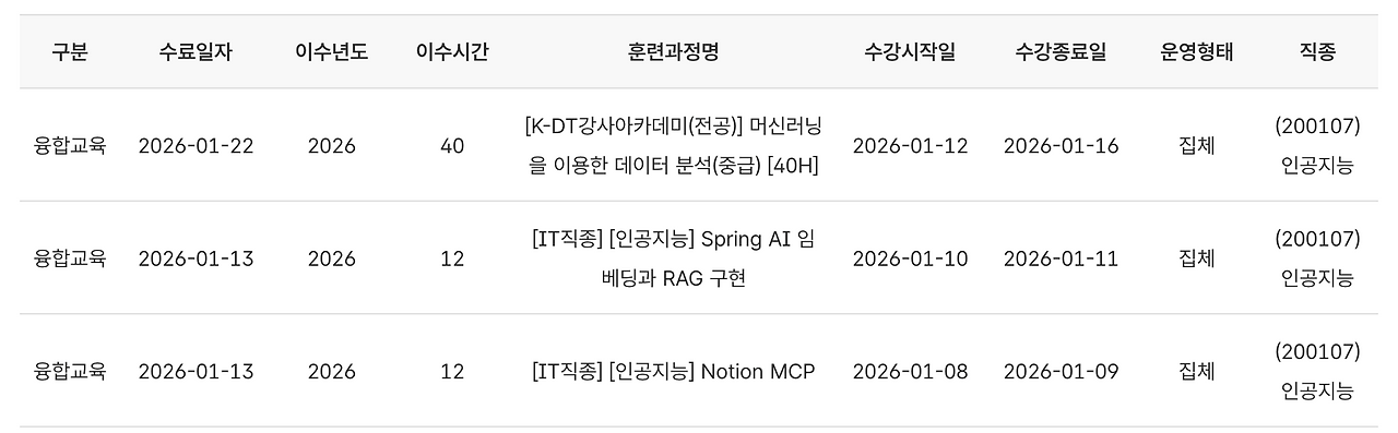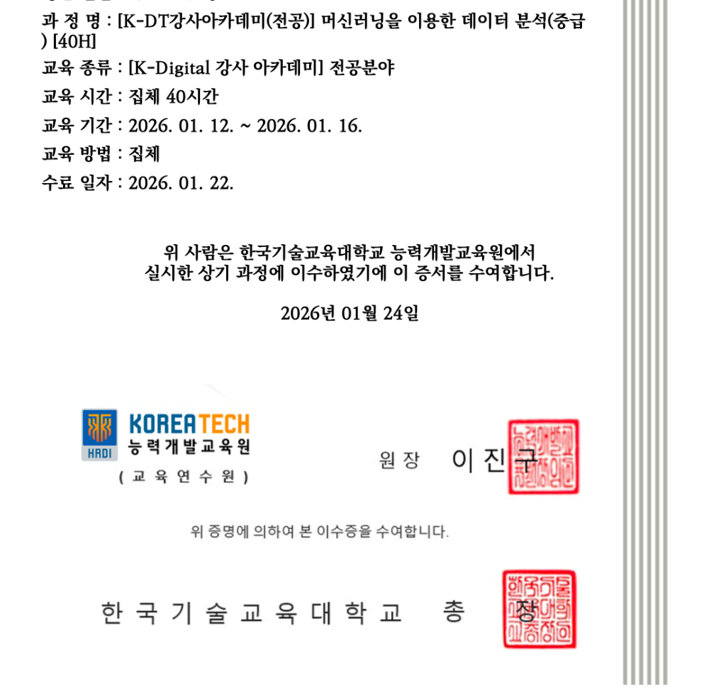 내가 한국방송통신대학교에 입학을 결심한 계기 중 하나가 K-DT 강사 아카데미 전공 머신러닝을 이용한 데이터분석 전공수업의 커리큘럼을 보고 쫄아서 통계데이터과학과에서 지도하는 전공과목이 인공지능과 관련된다고 생각해서 결정하게 되었다. 올 한 해만 벌써 인공지능 수업만 64시간 이수했다. 인공지능 전공교육 80시간이 목표였는데 벌써 목표가 고지다.
