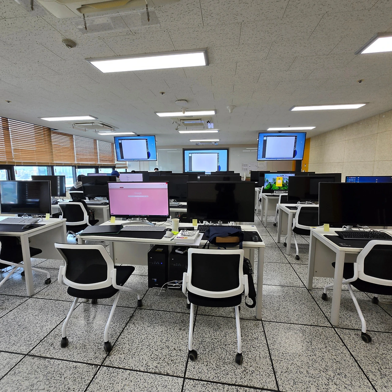 뭐야 너무 좋잖아? 나 짐 머신러닝에 디게 꽂혀있는데? 책상 중간중간에도 큰 TV가 여러 대 있어서 나처럼 굳이 맨 앞자리에 안 앉아도 된다. 근데 나는 강사 얼굴 보면서 수업 듣는 걸 좋아라 해서 맨날 앞자리에 앉는다.