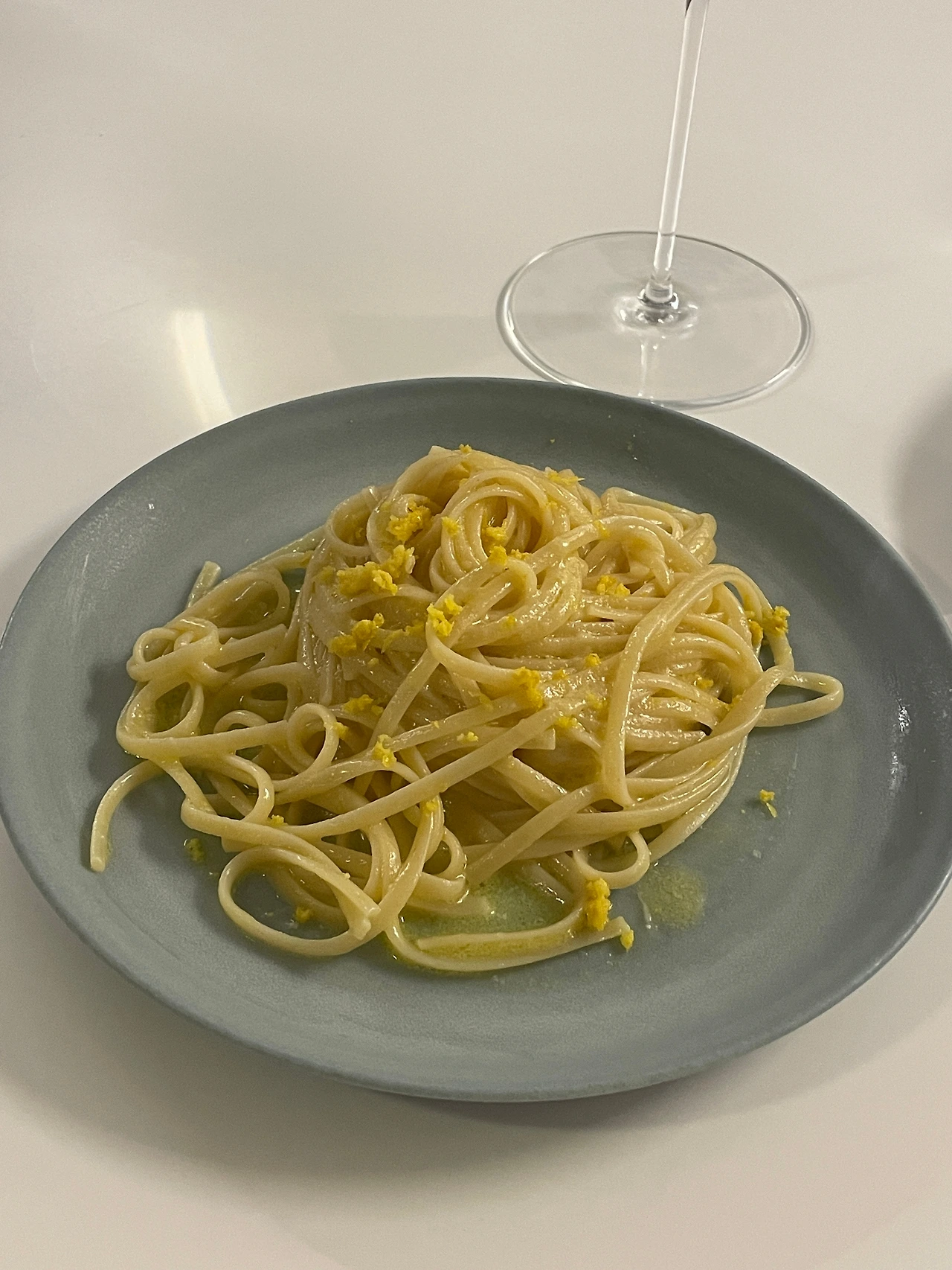 G: 어떻게 만들었냐면, 먼저 물에 레몬을 넣어서 30분 동안 끓여서 레몬 육수를 만들어. 그리고 면을 한 5분 정도만 삶았다가 팬에서 레몬 육수를 부어가면서 마저 익히는데 이게 리소토를 만드는 방식이랑 비슷하거든. 리소토도 보통 안 익은 생쌀을 넣고 육수를 부어가면서 거기서 익히잖아. 그걸 리소타레(Risottare)라고 불러. 그 과정을 거치고 면이 다 익으면 불을 끄고 올리브유, 버터, 파마산 치즈를 넣어서 비비면서 크림을 만들어. 그게 만테까레(Mantecare). 근데 난 만테까레는 잘 안 된 것 같긴 한데... ㅎㅎ 어쨌든 그 크림을 만들고 나서 플레이팅을 한 다음에 마지막에 레몬 제스트를 뿌려서 끝내는.*