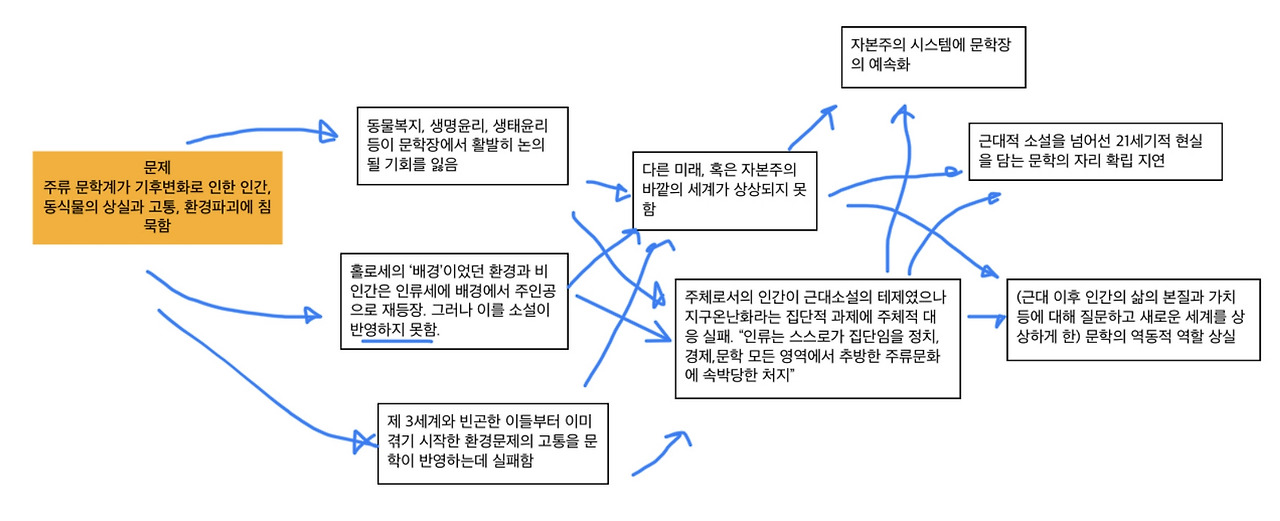 질문은 인식의 전환은 소설의 전환에도 영향을 끼칠까? 끼치고 있을까? 기후문제는 어떻게 인류세 소설의 주체가 될 것인가? 될 수 있을까? 소설이라는 장르는 기후문제를 포용할 수 있을까?
