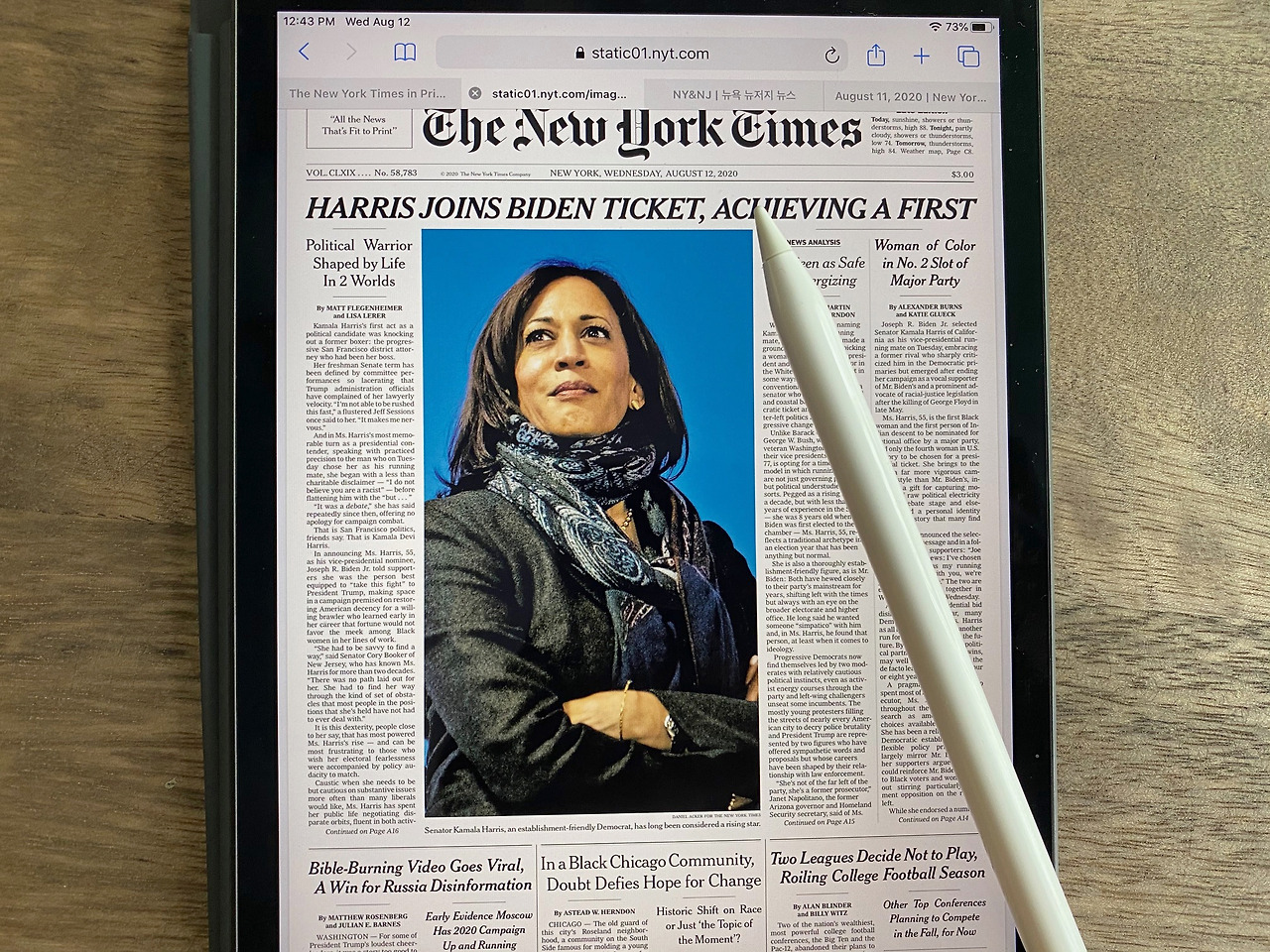 11일 카말라 해리스 캘리포니아주 상원의원이 흑인여성으로는 미국 최초로 민주당 부통령 후보에 올랐다. 다음날 뉴욕타임즈와 뉴욕포스트는 모두 해리스의 부통령 후보 소식을 1면 헤드라인으로 장식했지만 그 논조는 너무나도 달랐다.