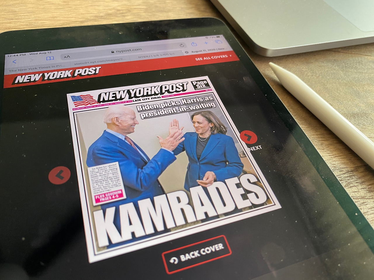 뉴욕포스트는 조 바이든 민주당 대통령 후보와 카말라 해리스가 서로 손벽을 마주치며 인사하려는 듯한 사진과 헤드라인으로 KAMRADES라고 쓰였는데 COMRADES라는 동지라는 영어 앞부분 COM을 카말라 이름 앞글자를 따라 KAM으로 바꿔서 표현했다.