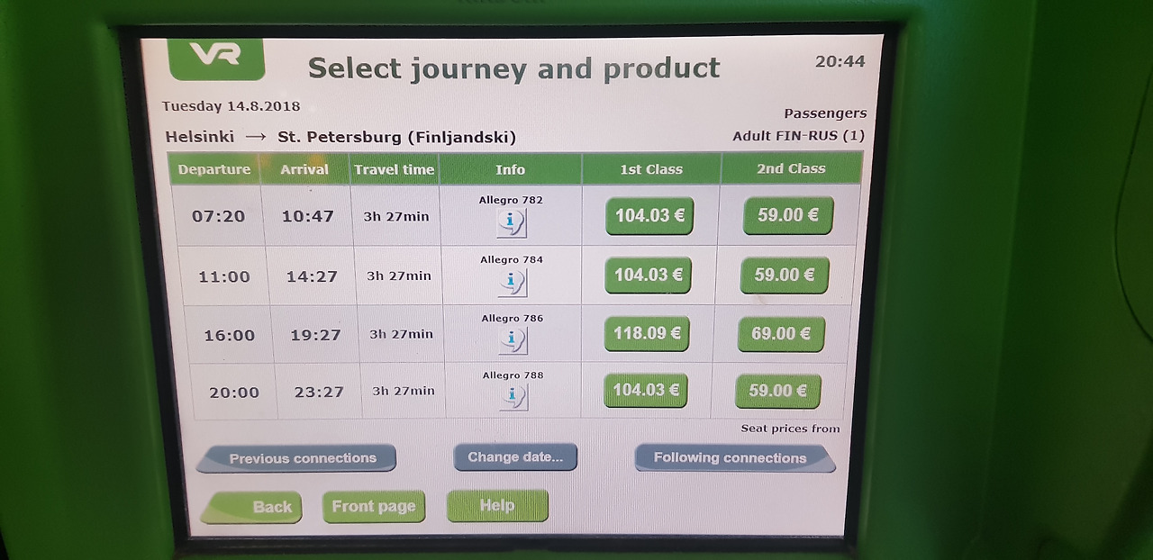 헬싱키에서 상트페테르부르크 까지는 VR이라는 고속열차로 이동했다. 상트페테르부르크행 라인을 알레그로(Allegro) 열차라고 부르는데 열차 예매 온라인 사이트가 다소 불안정하여 헬싱키 중앙역에 직접 방문해서 예약해야만 했다. 사실 열차를 예약하는 그 간단한 행위 자체만으로도 많은 에피소드들이 있었다.