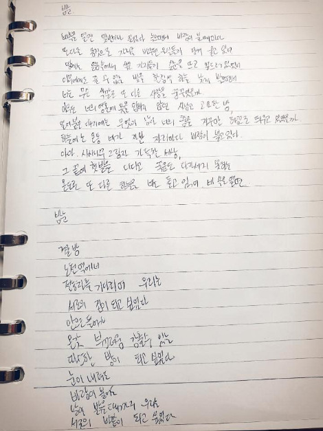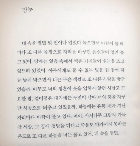 내 다이어리에 유일하게 기형도의 밤눈이 필사되어있었다. 꼭 간직하고 다녔던 것이다. 조금 전, 김광규의 밤눈을 바로 밑에 필사했다. 이제서야 내 마음속에 '밤눈'의 형상이 완성된 느낌이었다. :)