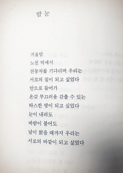너무 아름다운 시였다. 기형도의 "밤눈"에서 오는 가슴 아린 느낌을 마치 감싸주는 것 같았다. 단어 하나하나, 구절 하나하나 낭독해봤다. "서로의 집 안으로 들어가"라는 부분에서 실제로 내 몸이 따뜻한 난로가 있는 방에 들어가 몸이 녹는 것처럼 느껴졌다. 날이 밝을 때까지, 밤새도록, 누군가의 품속에서, 누군가가 내 품속에서 위로와 사랑을 주는 느낌을 받았다.