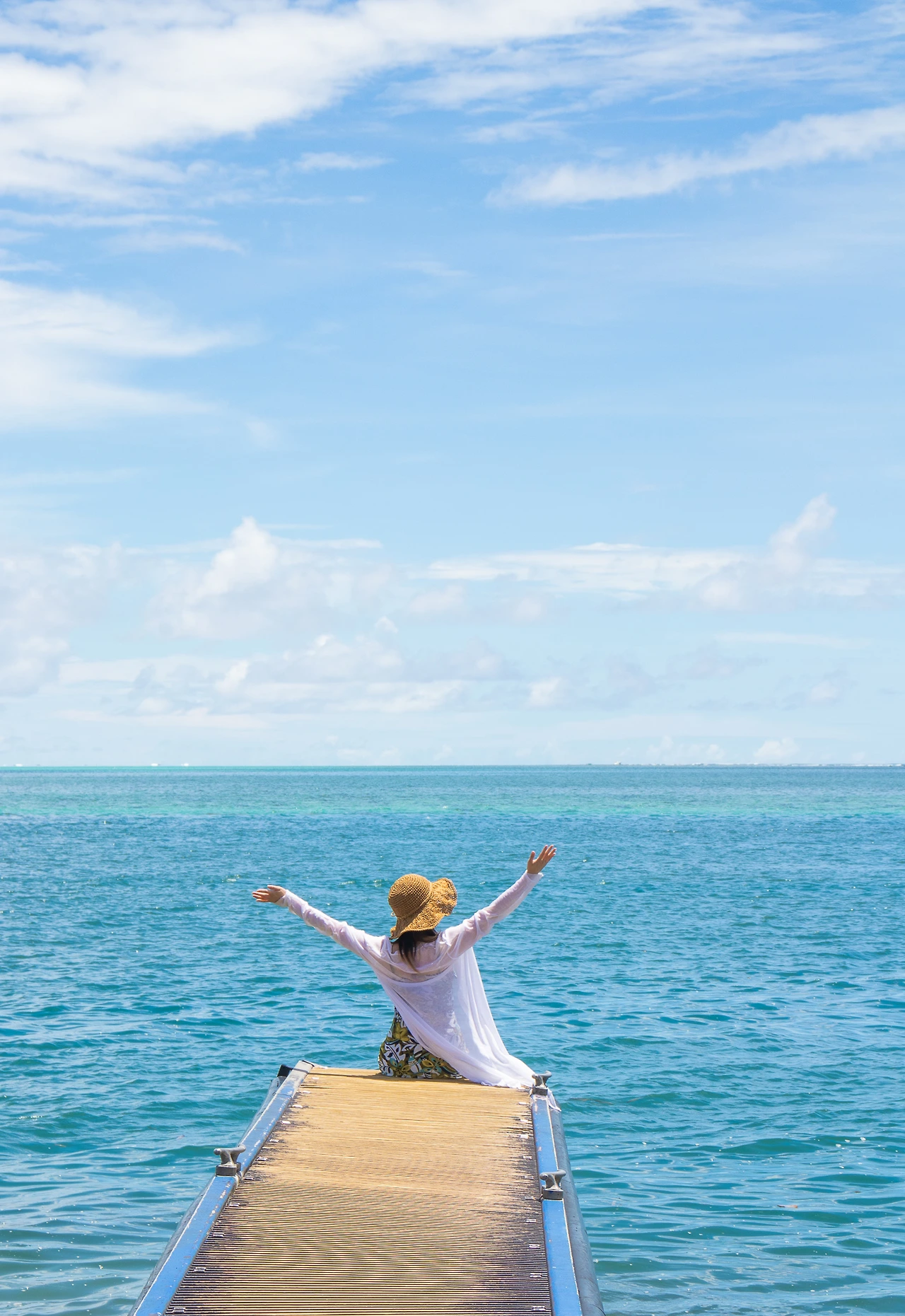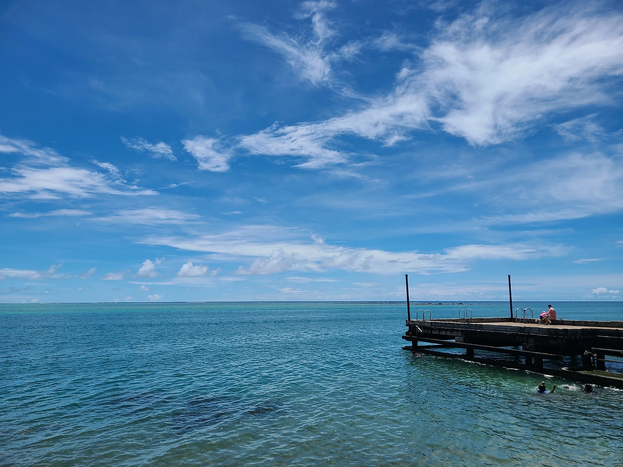 솔레다드 요새에서 더 남쪽으로 내려가서 거의 괌의 최남단에 있는 메리조 포구에 도착했다. 사진으로 보던 것보다 훨씬 더 시골스러운 작은 포구(부두)이지만 끈적이는 짠 내가 나지는 않는 산뜻함이 있다. 메리조 포구에서는 길게 드리워진 나무데크 끝에서 찍는 사진이 인기 있다고 해서 친구들과 열심히 찍었다. 파란 물빛 너머로 옥색 물빛이 얹어져 마음이 설렜다.