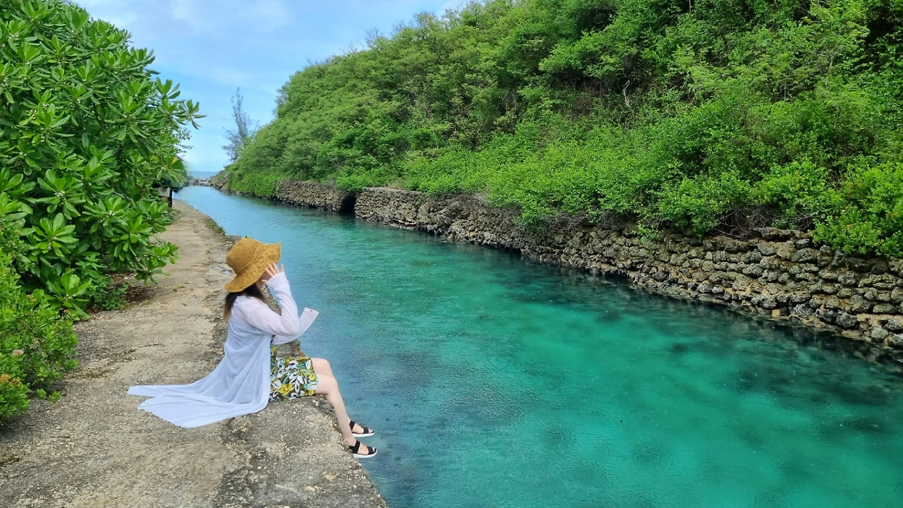처음 도착한 곳은 에메랄드 밸리 Emerald Valley. 괌 남부 투어의 시작은 거의 에메랄드 벨리에서부터 시작한다. 한국인들이 애용하는 호텔들이 많은 타무닝 시내에서 남쪽 방향으로 약 16km 내려가면 있는 비교적 가까운 곳이기 때문이다. 솔직히 말하자면 그냥 개천같이 생긴 하구인데 사람들이 많아서 정차하기 전부터 이곳이 에메랄드 밸리인 줄 알 수 있었다. 사실 인스타그램 사진들을 보고 어느 정도는 '필터 빨'일 거라고 생각했었는데 실제로 카메라 필터 없이도 아름답고 영롱한 에메랄드 물빛을 볼 수 있다. 다만 길이 몹시 좁아서 앞뒤로 오는 관광객을 피해 사진을 찍는 건 쉽지 않았다.