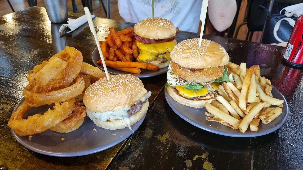 우리는 호텔 침대에 뒹굴거리다가 브런치를 먹기 위해 햄버거 전문점 '햄브로스 Hambros' 찾았다. 각자 마음에 드는 버거를 시켜놓고 기다리는 동안에도 다들 습관적으로 업무 메일을 확인하고, 회사 카톡을 읽는다. 말하지 않아도 서로 회사 업무를 보고 있다는 걸 안다. 미간이 찌푸려 있기 때문이다. 주문한 음식이 조금만 더 늦게 나왔다면 미간이 좁아지다 못해 눈썹이 붙어버릴 참이었다. 다행히 금방 햄버거가 나왔고 나지막한 환호와 함께 모두의 미간이 활짝 펴졌다. 크게 한 입씩 썰어먹고 나니 만족스러움에 미소가 번지는 서로의 얼굴을 보며 다 같이 고개를 끄덕였다. 햄버거야 한국에도 많지만, 이 버거는 느낌부터 다르다. 왜냐면 회사에서 일할 시간에 출근하지 않고, 괌에서 먹는 버거니까!