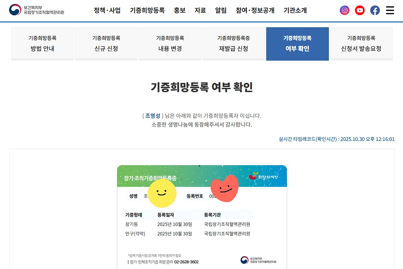 저는 보건복지부 국립장기조직혈액원에 제가 사망하거나 뇌사상태가 되었을 때, 장기들과 안구(각막)를 기증하기로 신청하여 등록을 완료했습니다.