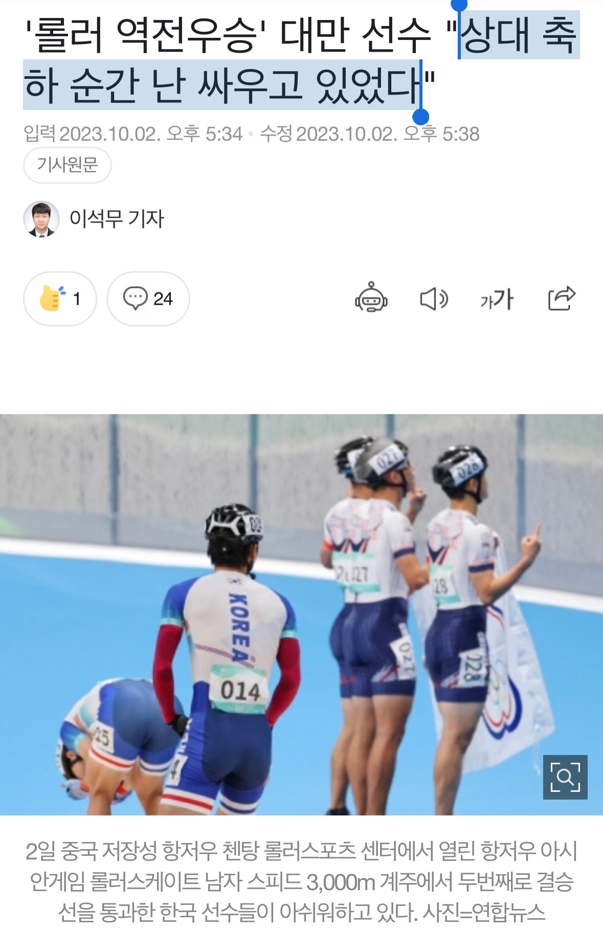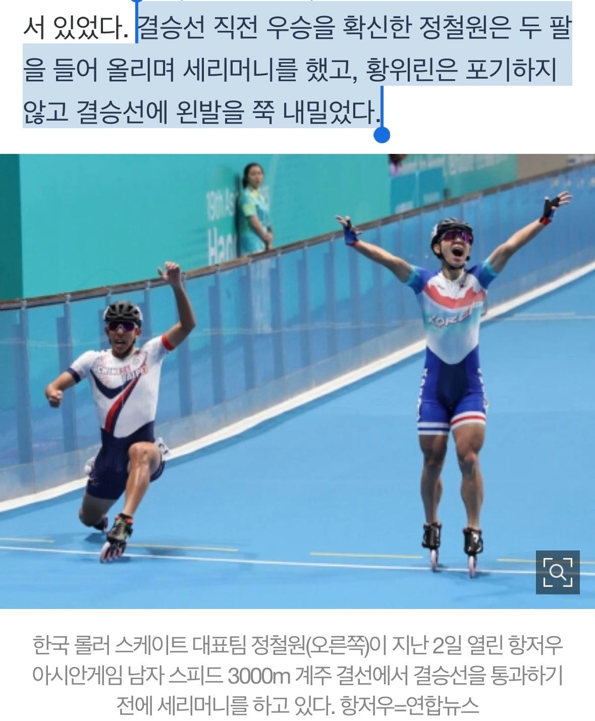 글로 또, 언급하는 게 선수분들에게는 죄송하지만 이번 롤러스케이트 경기를 보며 ‘끝날 때까지 끝난 게 아니라는 것’을 다시 한번 느끼게 되었다. 승리했다는 도취감에 한국선수는 게임이 종료되기 이전부터 세리머니를 했고, 대만 선수는 결승선에 닿는 그 순간까지 게임을 포기하지 않았다. 결국 게임이 끝나고 최종적으로 미소 지은 자는 게임을 끝까지 포기하지 않은 대만 선수였다. 어떤 일이나 업무, 도전을 할 때 그것이 다 끝나고 웃을 수 있는 사람은 마지막까지 열과 성을 다한 사람이 아닐까 라는 생각이 들었다.