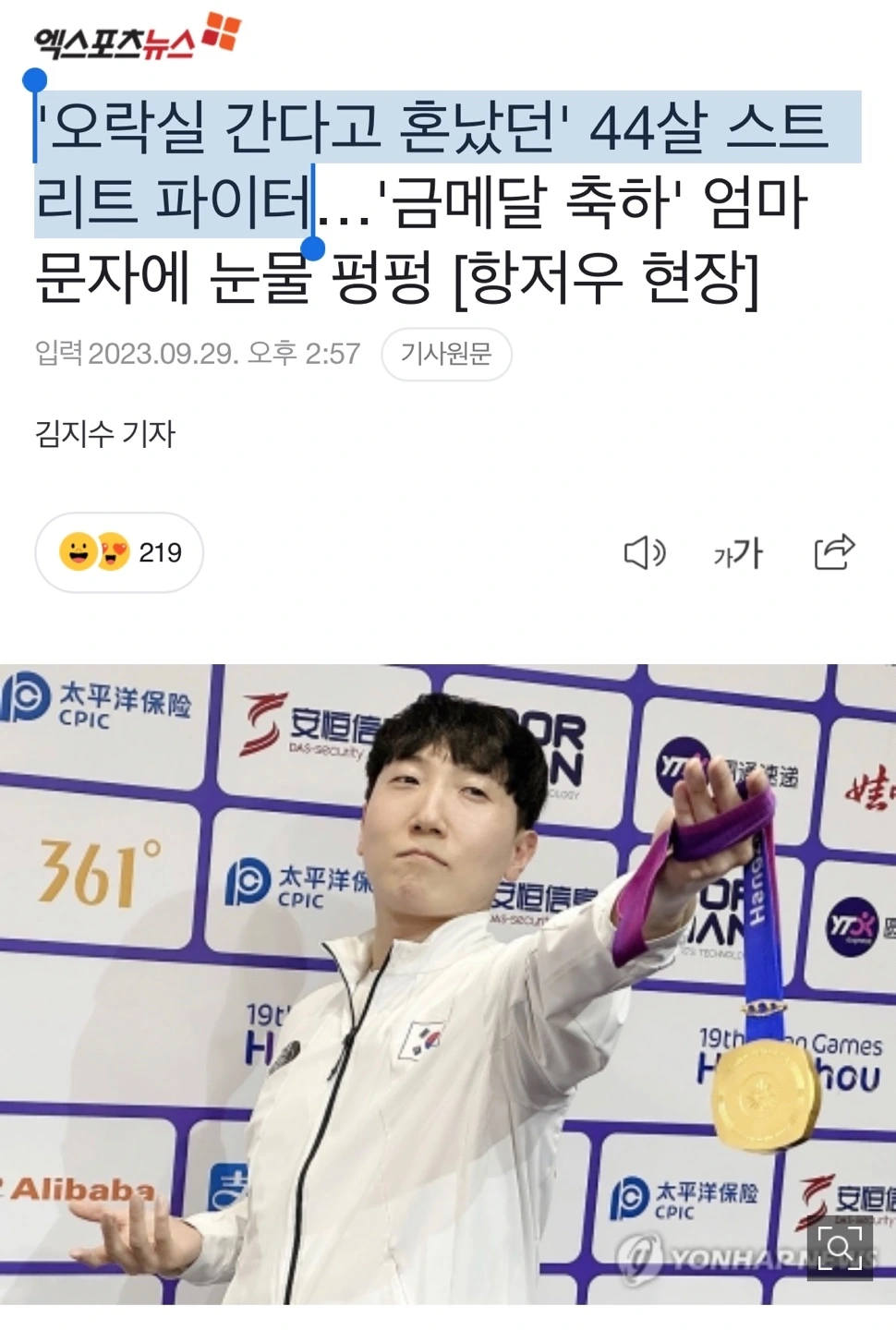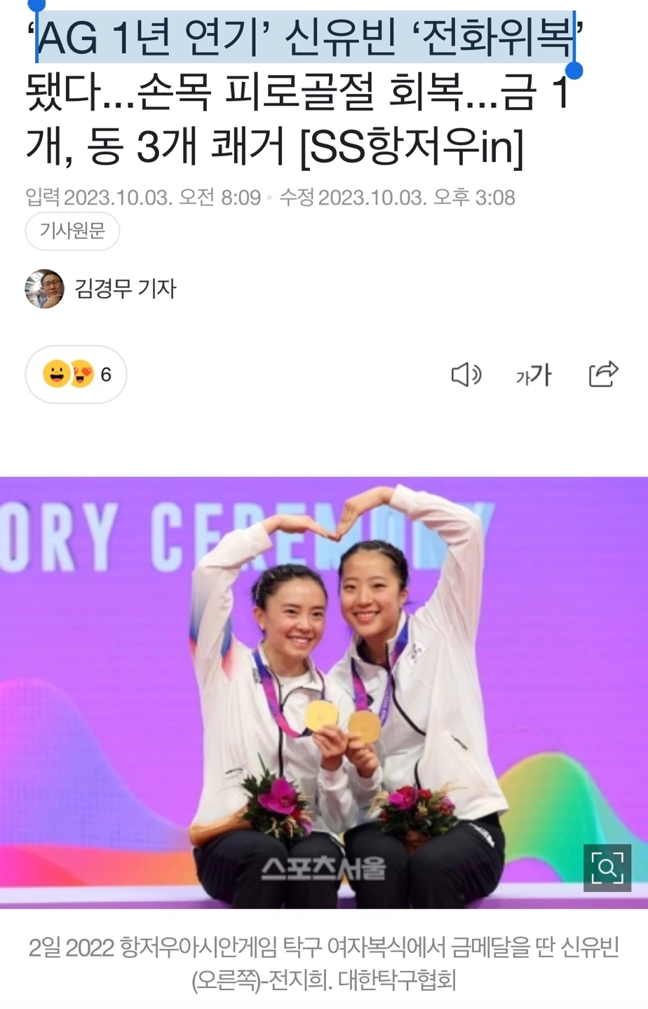코로나 19로 1년 연기된 덕분에 항저우 아시안게임에 참여할 수 있게 된 신유빈은 20살이라는 나이에 아시안게임 금메달을 손에 넣었다. 스타킹 등의 TV 프로그램에서 탁구 신동으로 유명세를 얻었던 그녀가 벌써 성인이 되어 금메달리스트가 되었다는 것에 격세지감을 느꼈다.