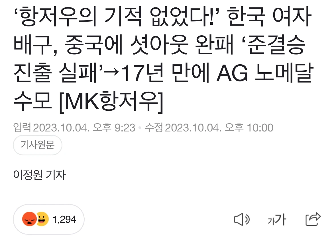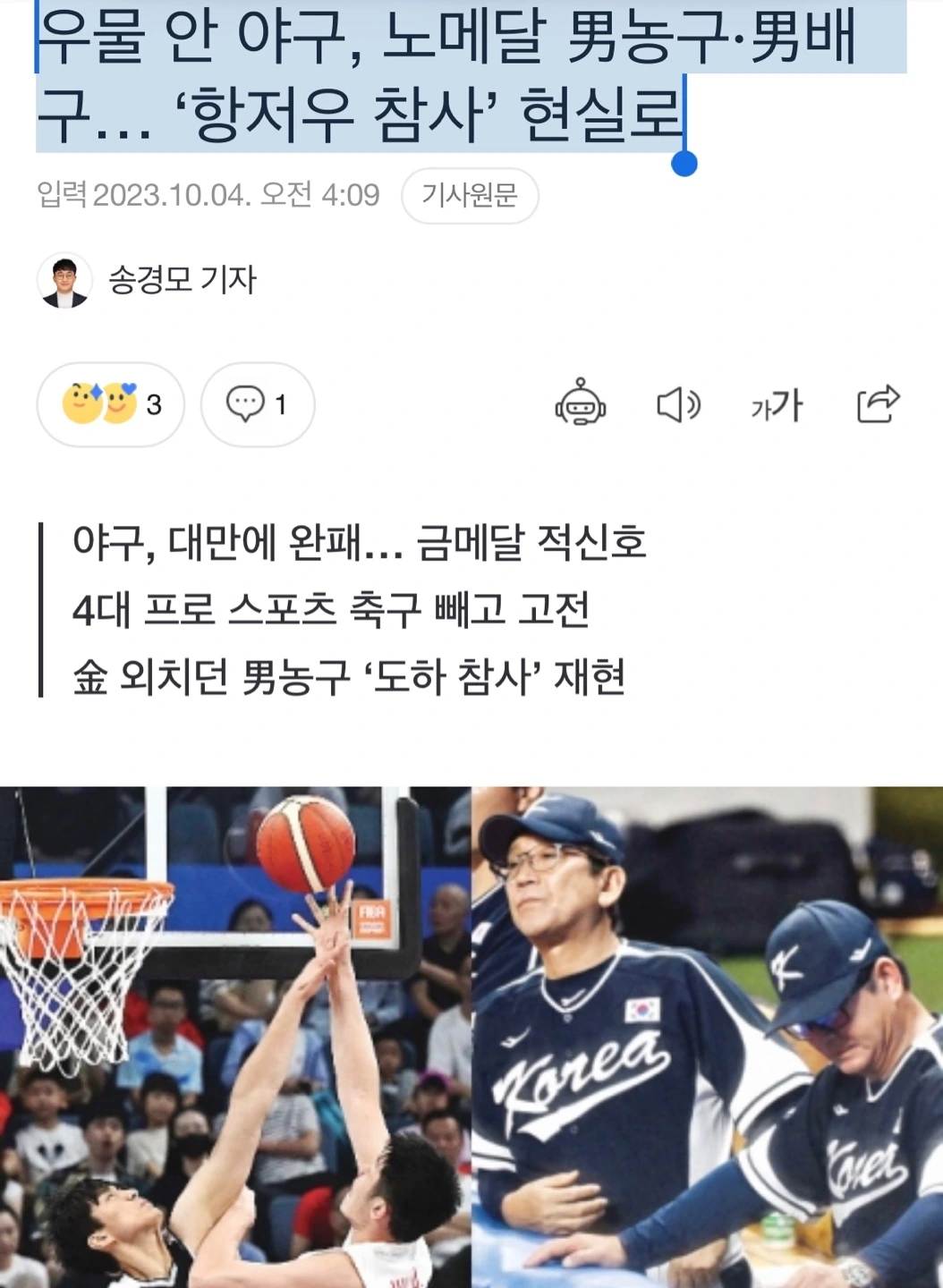 이번 항저우 아시안게임에서 가장 충격적인 부분은 구기 종목의 몰락이다. 남, 녀 농구 모두 8강에서 탈락했고 여자배구와 남자 배구는 각각 몇 십 년 만에 노메달의 수모를 겪게 되었다. 여자 축구팀 역시 8강에서 북한을 만나 탈락했고 아직 탈락은 아니지만 야구대표팀도 금메달로 가능 여정이 쉽지 않아 보인다. 구기 종목의 몰락이 다른 종목들의 부진에 비해 더욱 대비되는 까닭은 그 선수 면면이 국내에 수많은 팬을 거느리고, 적게는 수억에서 많게는 100억 원 대의 연봉의 수령하는 스타플레이어들이기 때문이다. 국내에서 일인자로 기세 등등 했던 그들이 프로스포츠도 제대로 자리잡지 않은 나라에게, 수천만 원의 연봉을 받고 있는 선수들에게 패하는 것을 보며 상대국가가 잘하는 것인지 우리나라 선수들의 명성에 거품이 껴있는 것인지 진심으로 궁금해졌다. 배부른 돼지는 결코 아침에 일어나지 않는다. 국제 대회에서의 수모를 교훈 삼아 우물 안 개구리에서 벗어나야 한다. 개인적으로는 연봉 거품 좀 빠졌으면 좋겠다. 자만하면 큰코다친다.