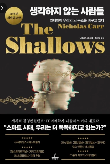 그러나 인터넷의 발명, 스마트폰의 발명은 선대인이 발명한 책의 영광을 처참히 무너뜨리고 있다. '끊임없이 새로운 정보를 제공하고, 알림이 울리고, 이곳저곳 들여다보게 습관을 만드는' 인터넷 세상은 사람들의 정신을 산만하게 만들고 있다. '깊이 읽기'보다는 훑어 읽기, 많이 읽기, 무의식적으로 읽기를 만들어 내고 있다.