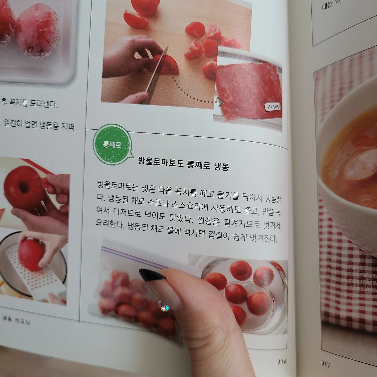 써먹을 수 있을 것 같아서 찍어 둔 페이지는 요 정도. 둘 다 지금 냉장고에 있는 친구들이지만, 언제 할 지는 잘 모르겠다. 방울토마토는 내일까지도 안 쓰면 얼리긴 해야 할 것 같다. 아, 이렇게 냉동실이 차게 되는 거구나... 그래도 본의 아니게 다음 주는 밀접 접촉으로 1주일 재택근무라, 하나씩 챙겨먹으면 생각보다 잘 먹고 다닐 수 있지 않을까? 이 마음으로 남은 주말은 치킨에 빙수 배달에 레토르트에 컵라면까지 열심히 먹었지만, 평일에는 좀 더 건강하게 살아 봐야지.