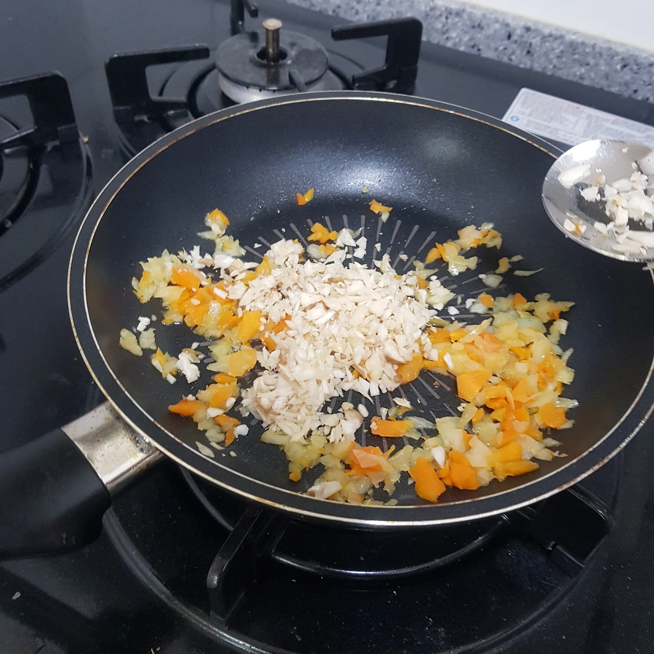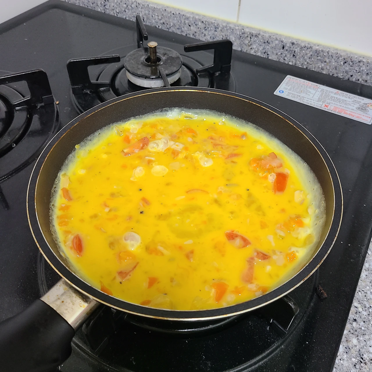 칼질이 서툰 내가 다지기 기계 덕에 그럭저럭 사람 구실을 한다. 아무튼 목표를 계란 오믈렛으로 잡고, 볶음밥을 만들려고 얼려 두었었던 당근과 양파를 꺼내고, 죽을 것 같아서 다져 둔 미니 새송이도 꺼냈다. 대충 솔솔... 볶고, 음. 맞겠지? 오늘의 야매 요리는 이런 레시피였다. 물론, 옳은(?) 순서인지는 잘 모르겠다.