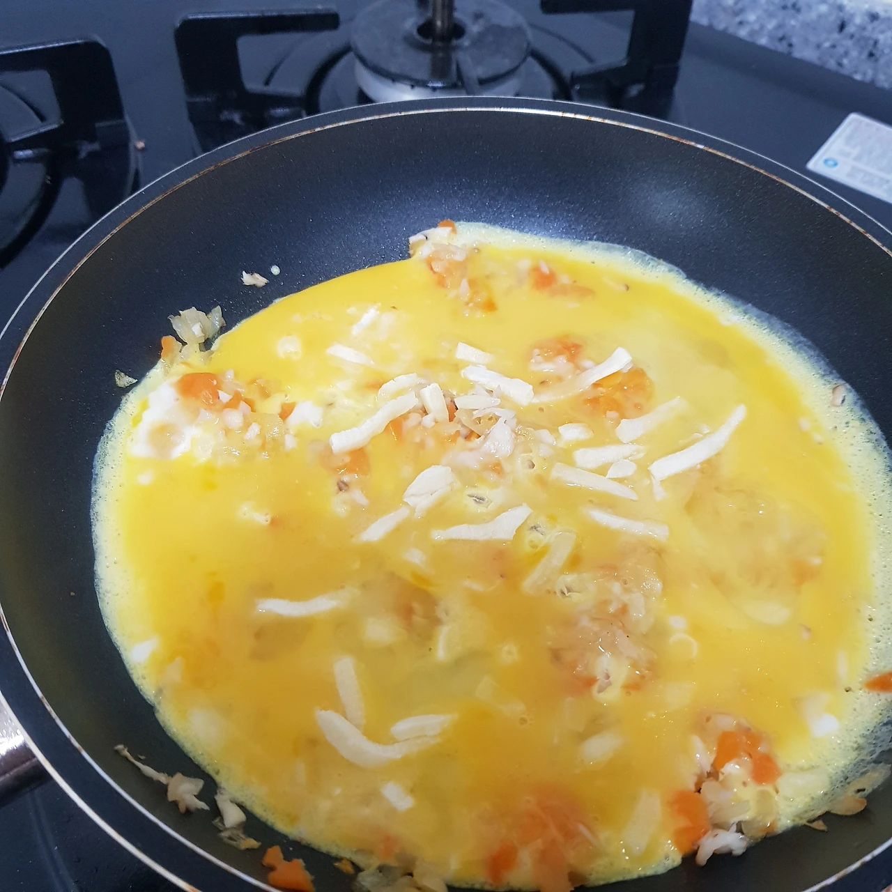 야채가 있던 팬에 계란 붓고 피자치즈 솔솔