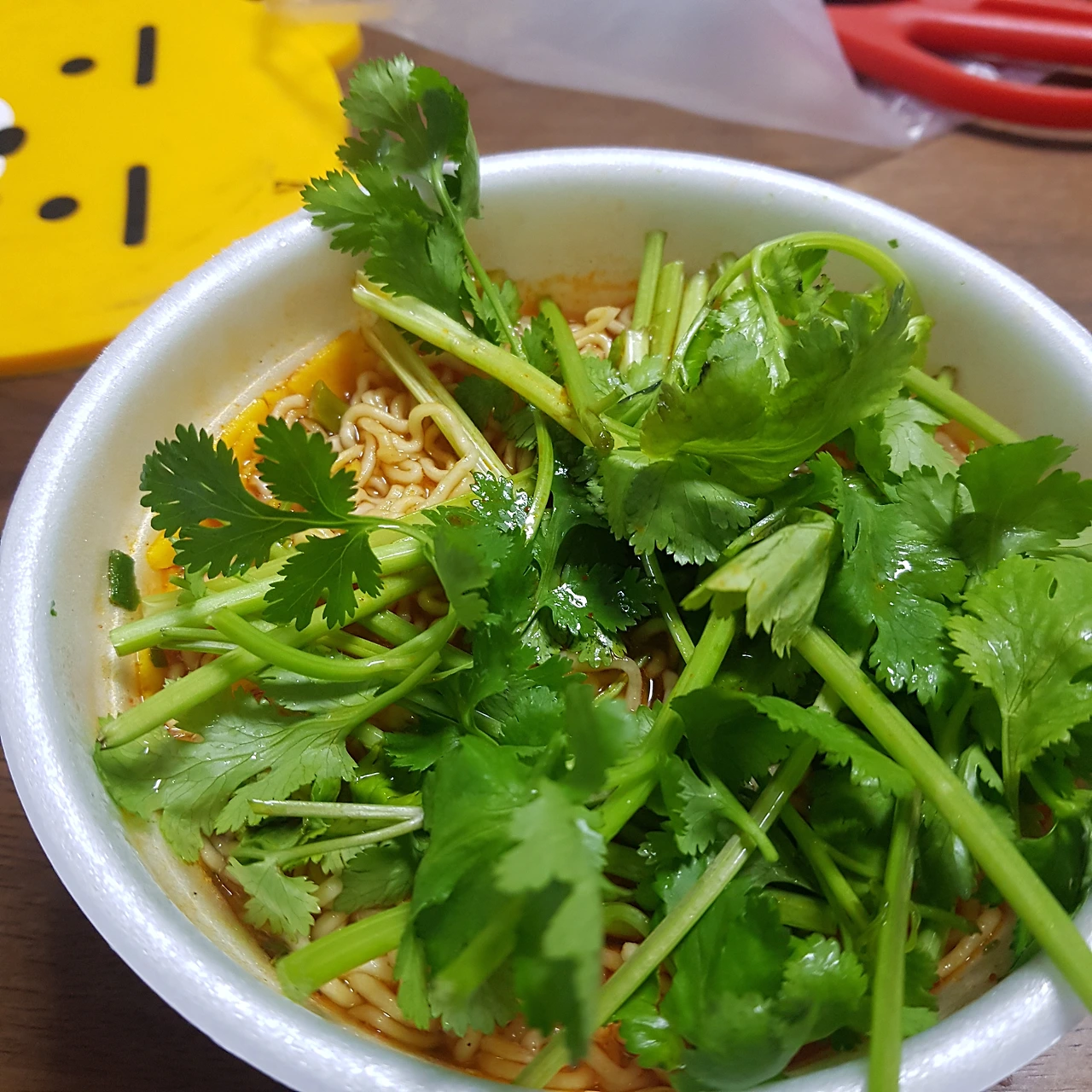 그래도 신상 컵라면에 고수 얹어 먹었더니 맛있었다. 크기는 생각보다 많이 작다.