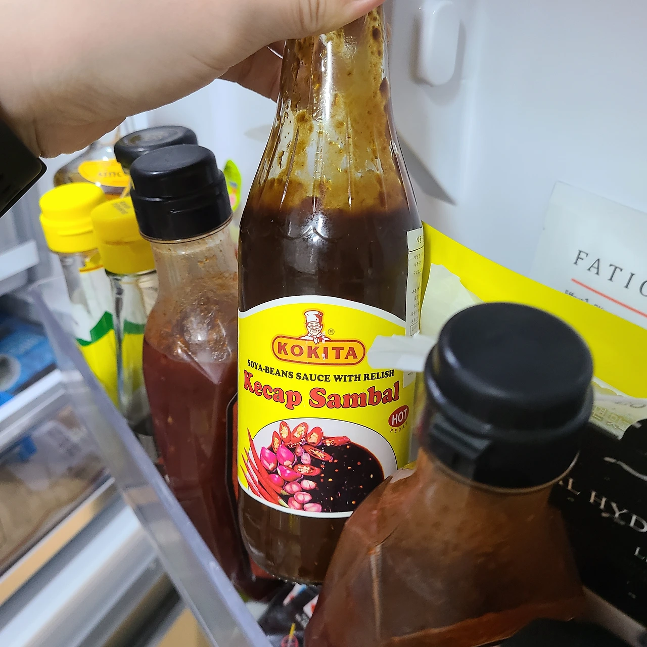 5. 양념치킨 소스 한 숟갈을 넣고 볶다가, 밥 한공기 반 정도를 넣고 양념치킨 소스 1큰술, 삼발 소스 반큰술, 굴소스 1큰술로 간을 맞춘다.