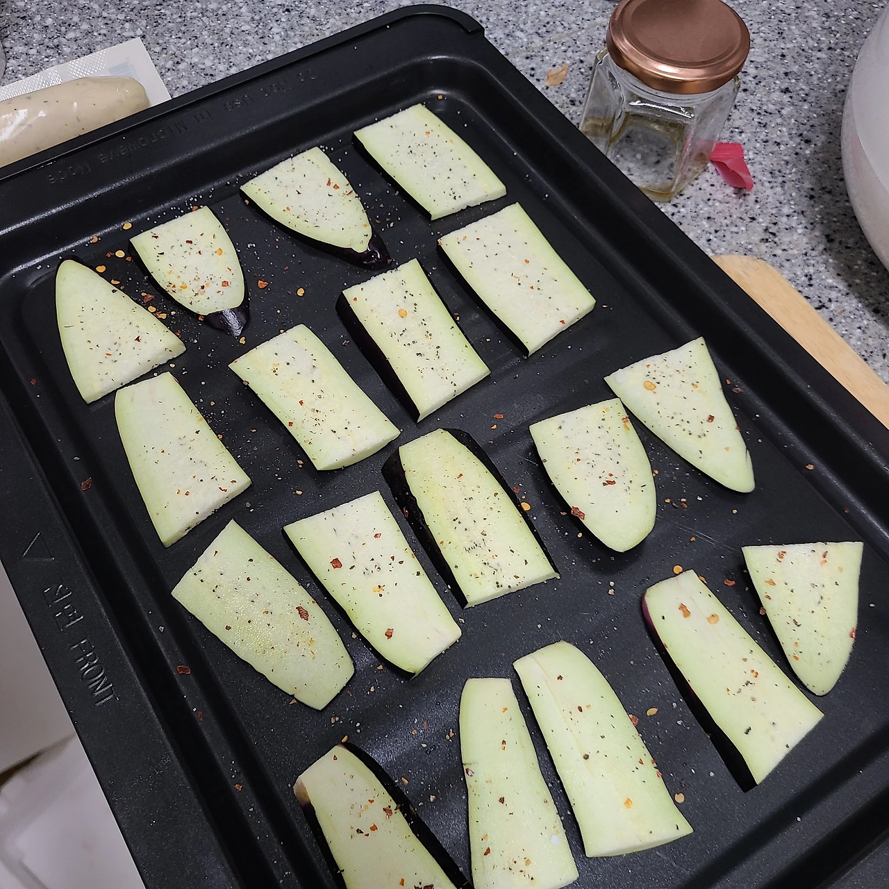 1. 가지를 최대한(?) 얇게 썰어서 오븐에 180도 7분을 누른 채로 넣었다(예열 없이)