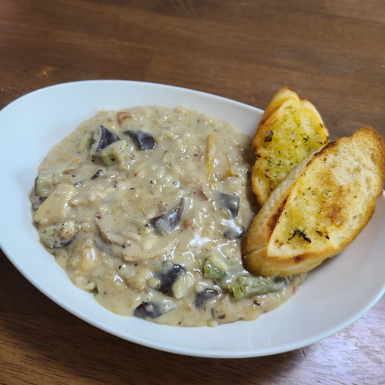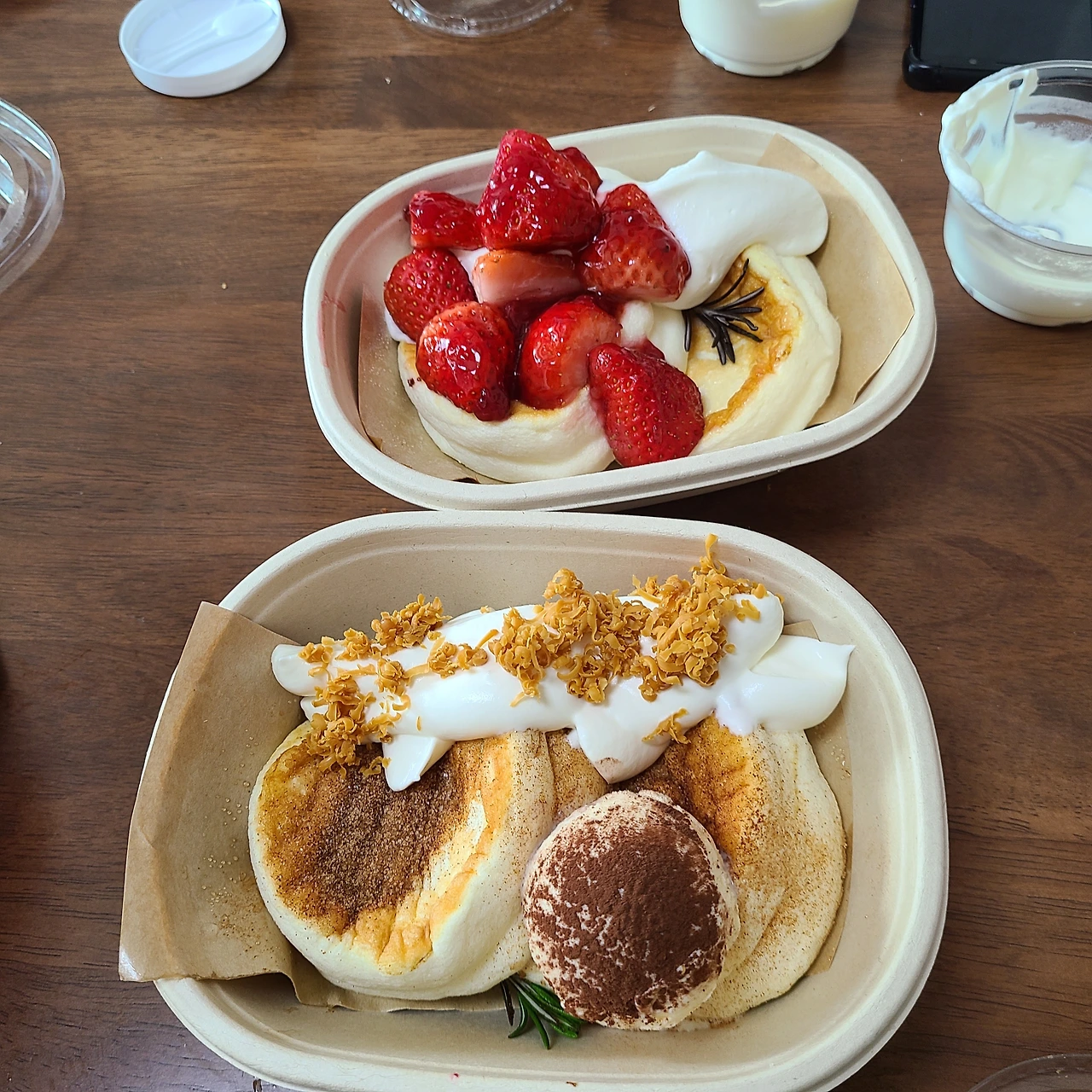 다음날 아침은 주말답게 늦잠으로 패스...가 아니라, 본격 아프기 시작해서 일어날 수 없었다. 금요일에 늦게까지 일한 것도 있었던 것 같다. 반면에 조금 살아난 언니가, 양갈비 소스 양파, 버섯, 가지를 추가하여 리조또를 해 줬다. 사 먹는 것만큼 맛있었다. 역시 우리집 수석 쉐프! 먹고 힘을 내서 다시 일하는데, 언니가 옮긴 것으로 추정되는 친구에게 점심을 보낸 답례로 수플레 팬케이크가 왔다. 오고 가는 고급진 정 사이에서 덕분에 포식을 했다.