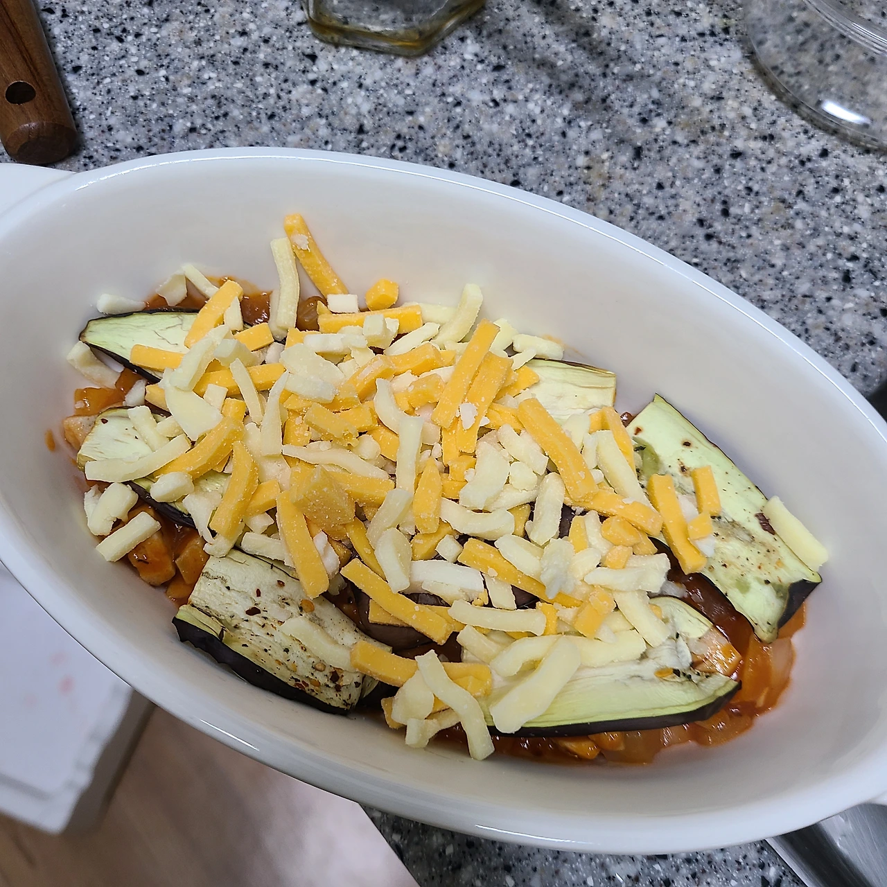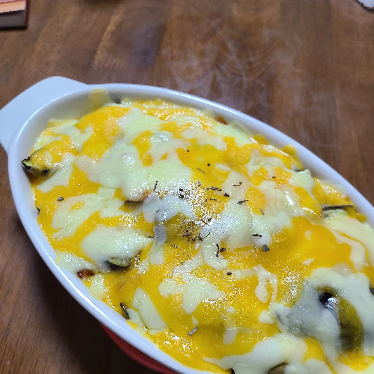 그라탕 그릇 및에 채워넣고 가지를 얹도 치즈를 뿌린다.