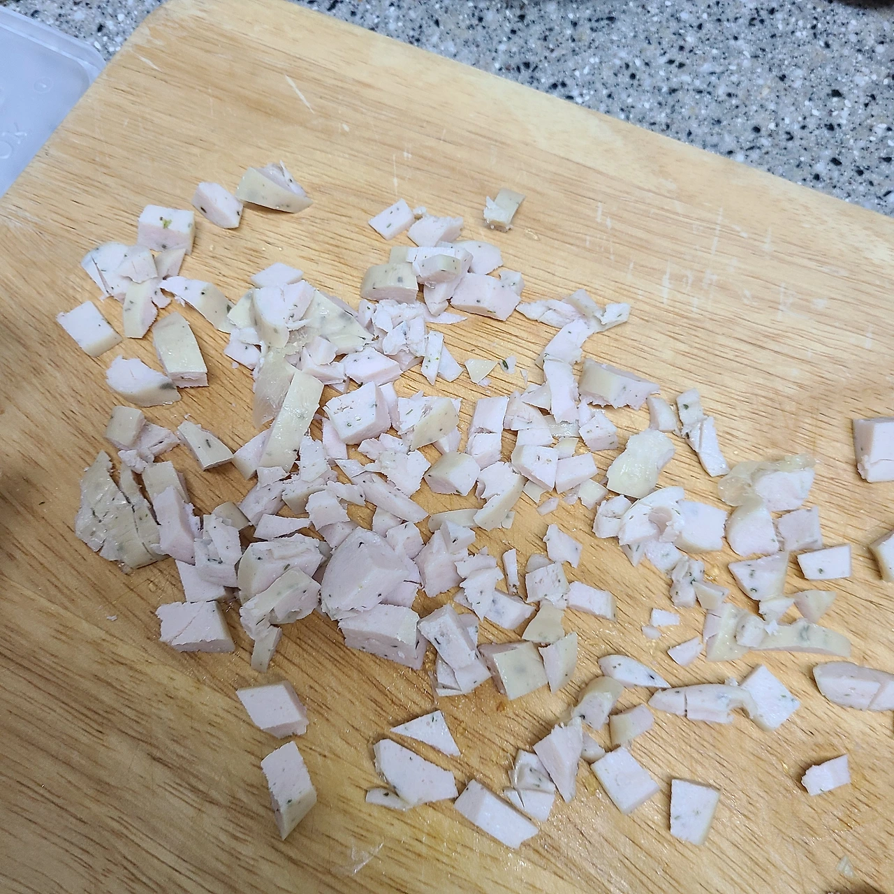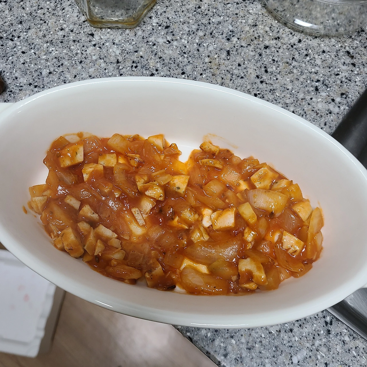 양파랑 닭가슴살 소세지를 잘 다져서 볶다가, 토마토 소스를 투입해서 같이 볶은 후