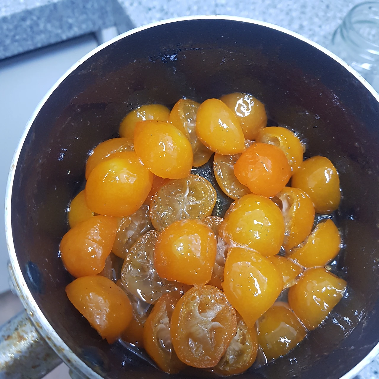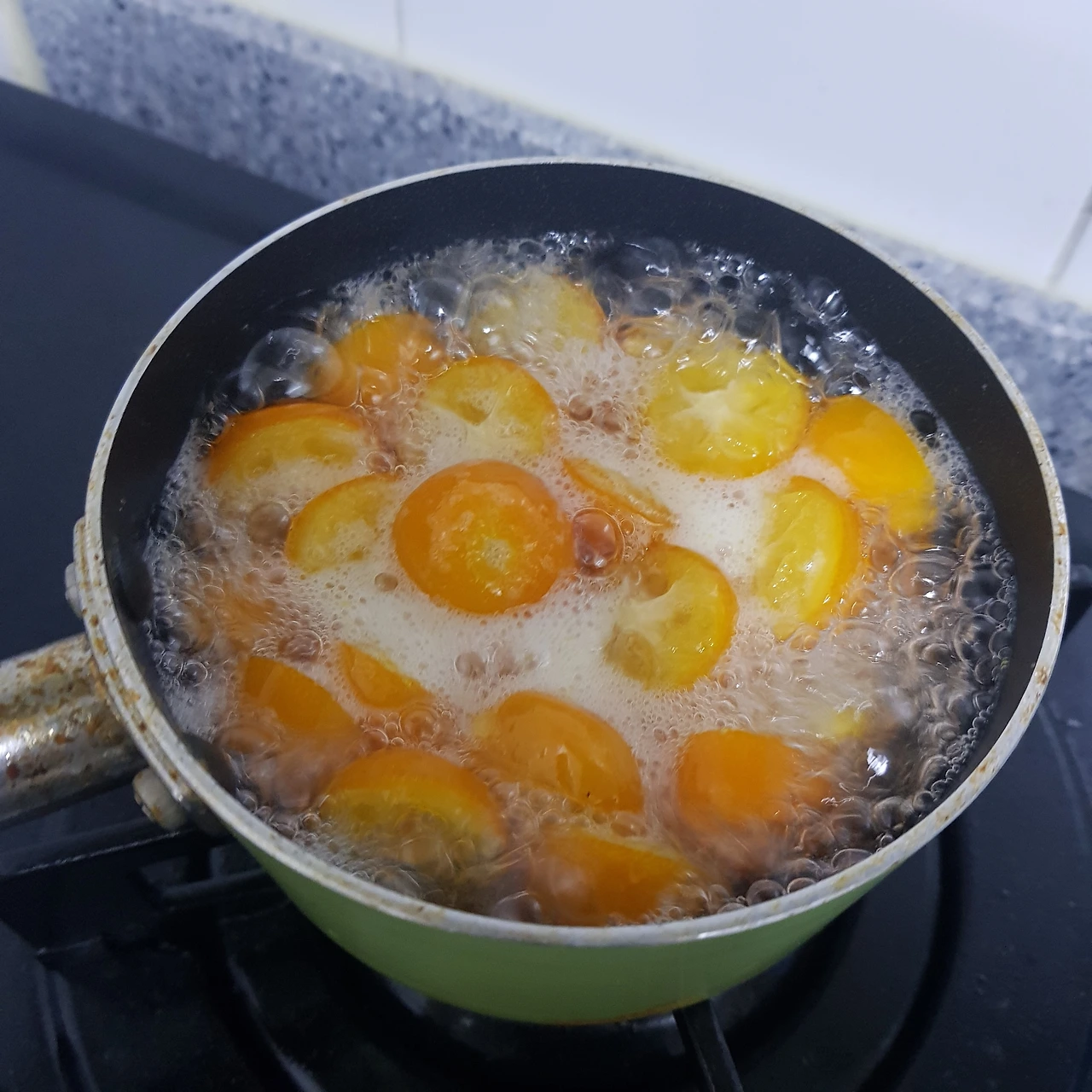 4. 금귤이 투명해질 때까지 자작하게 졸이라는데, 얼마나 투명해져야 하는 지는 몰라서 그냥 수위가 금귤 1/2 정도로 낮아질 때까지만 했다.