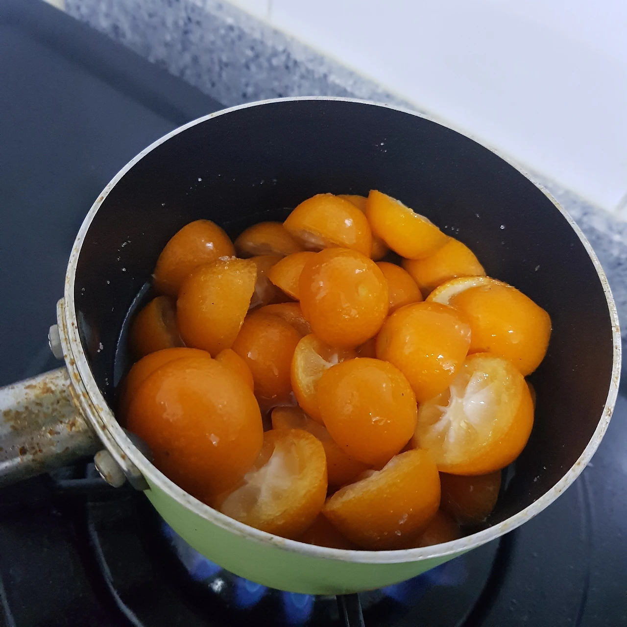 2. 금귤과 금귤의 1/3 정도의 설탕을 소스팬에 붓고 섞다가, 영 안 녹아서 설탕의 반 정도의 물을 넣고 저으면서 약불로 살살 녹였다. 바닐라빈은 없고 바닐라 익스트랙을 두 티스푼 정도 넣었다.