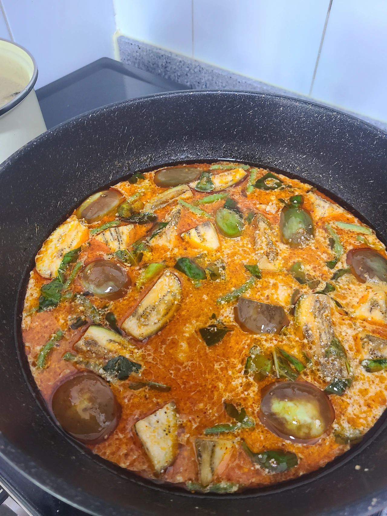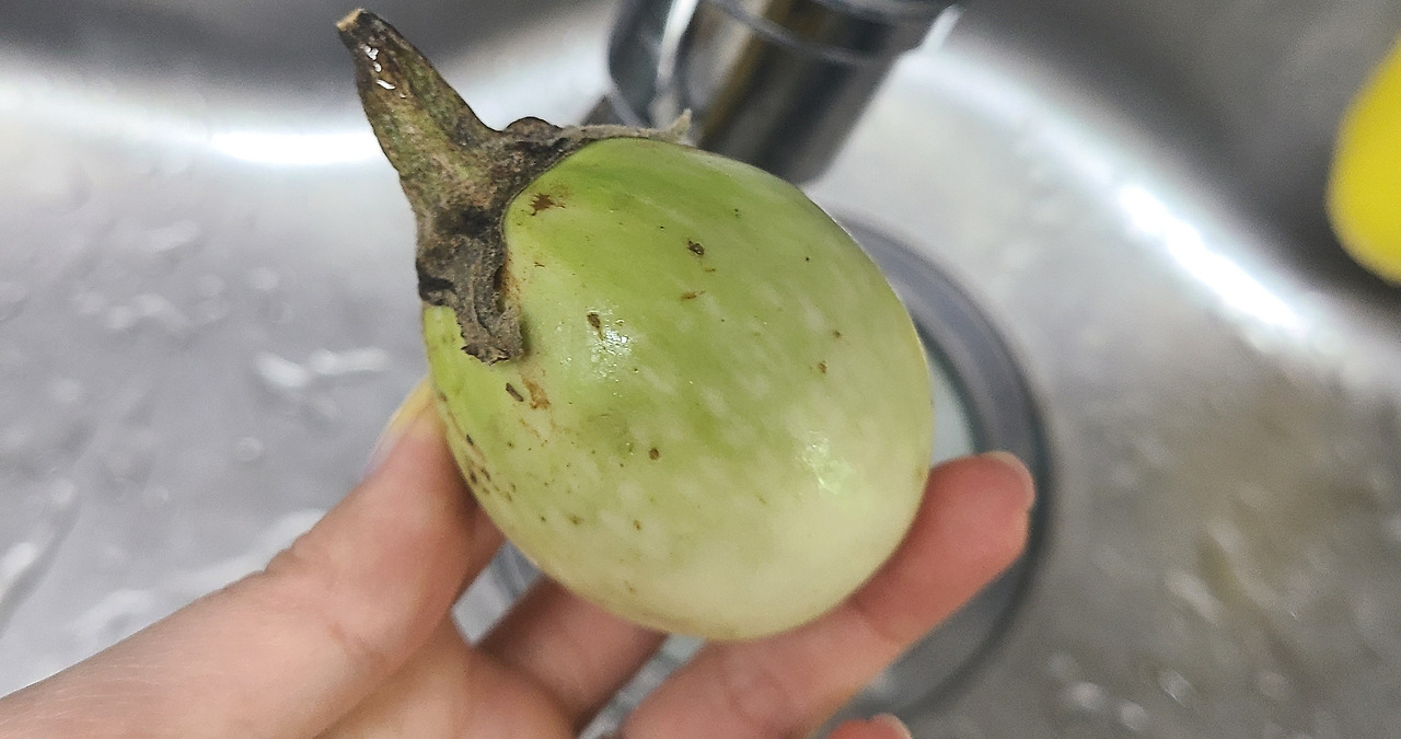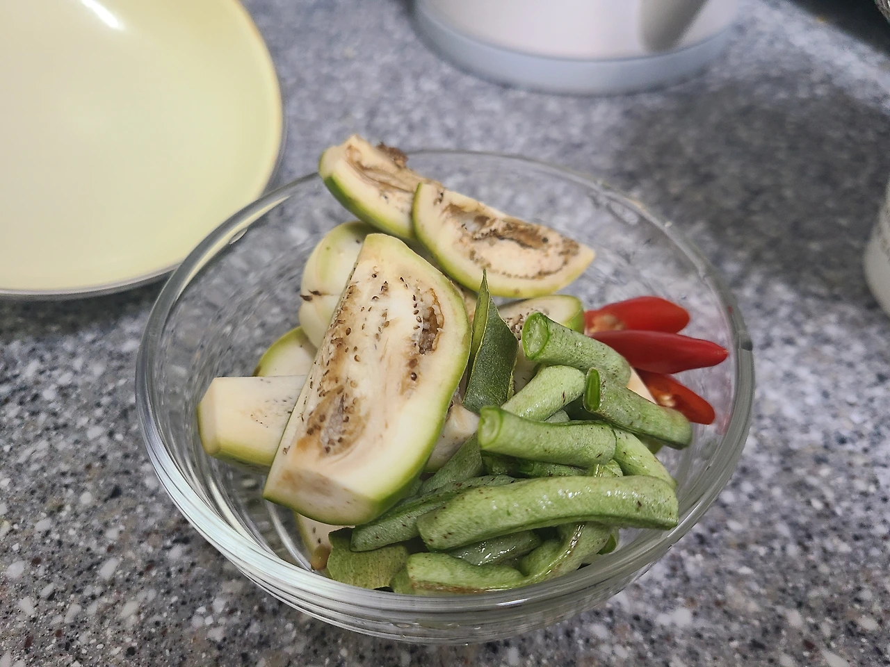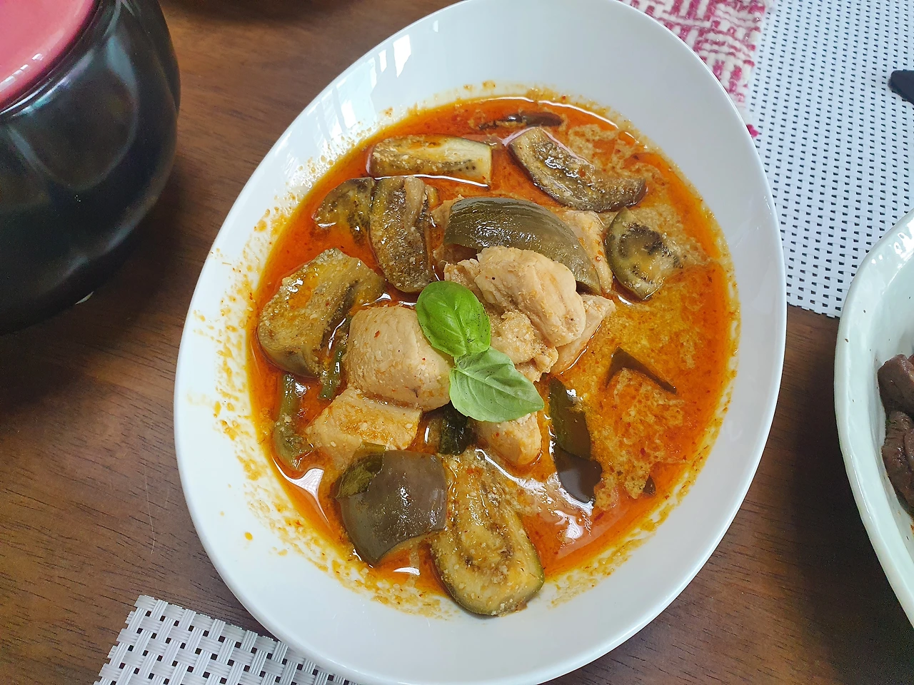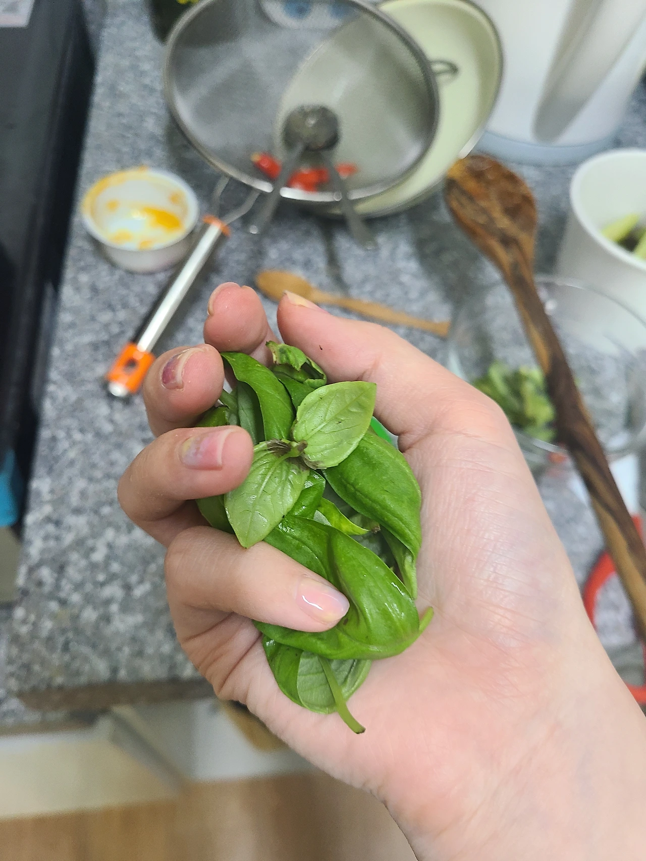 태국 가지(마크아 가지) 2개, 베이비 가지 20알(나는 없어서 생략하고 마크아 가지를 2배 넣음), 찢은 카피르 라임잎 4장(마른 잎으론 약 3~4배), 피쉬소스 2큰술, 팜슈가 2큰술, 스위트바질 반컵(토핑용 포함), 어슷썬 붉은 고추 반개(토핑용), 식용유 2큰술