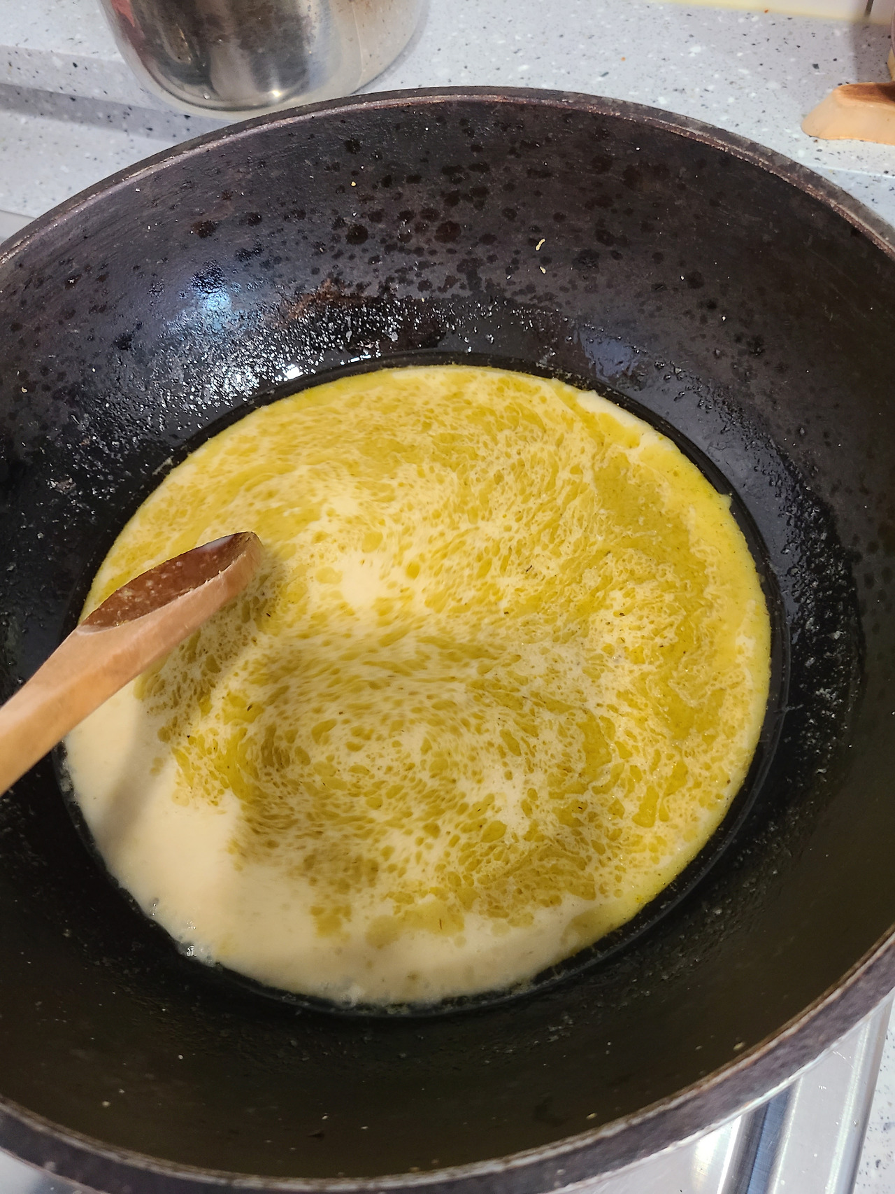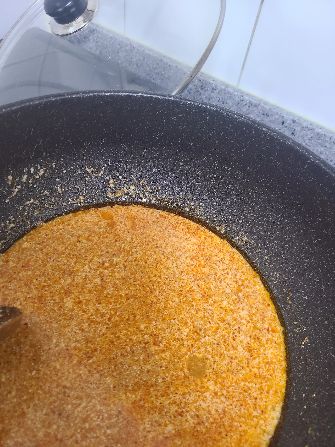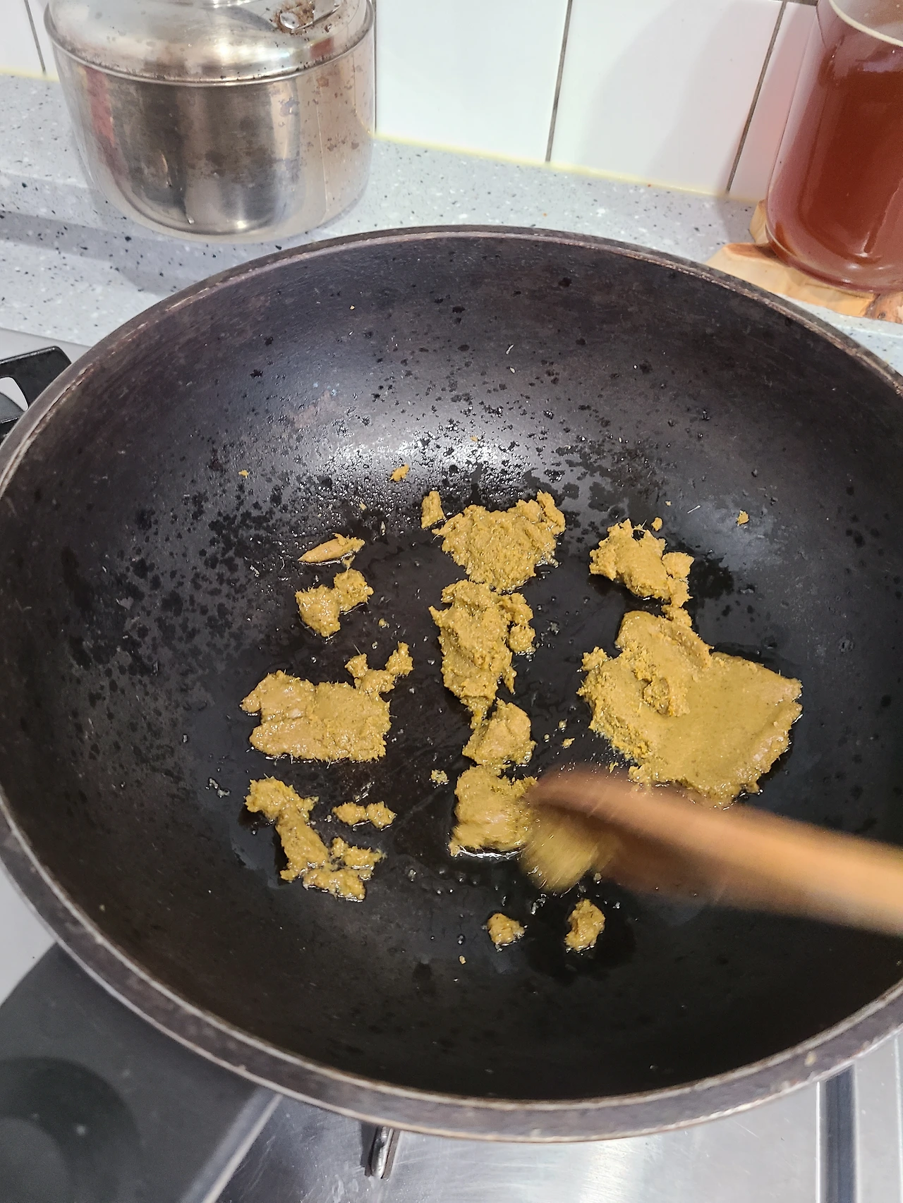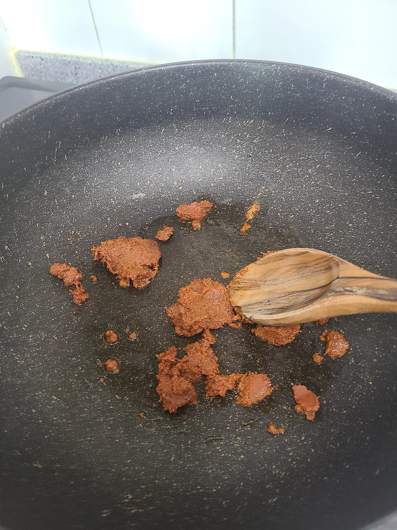2. 식용유를 두른 팬에 페이스트를 넣고 중불에서 볶는다. 향이 좋아질 때까지(레시피가 그렇다).