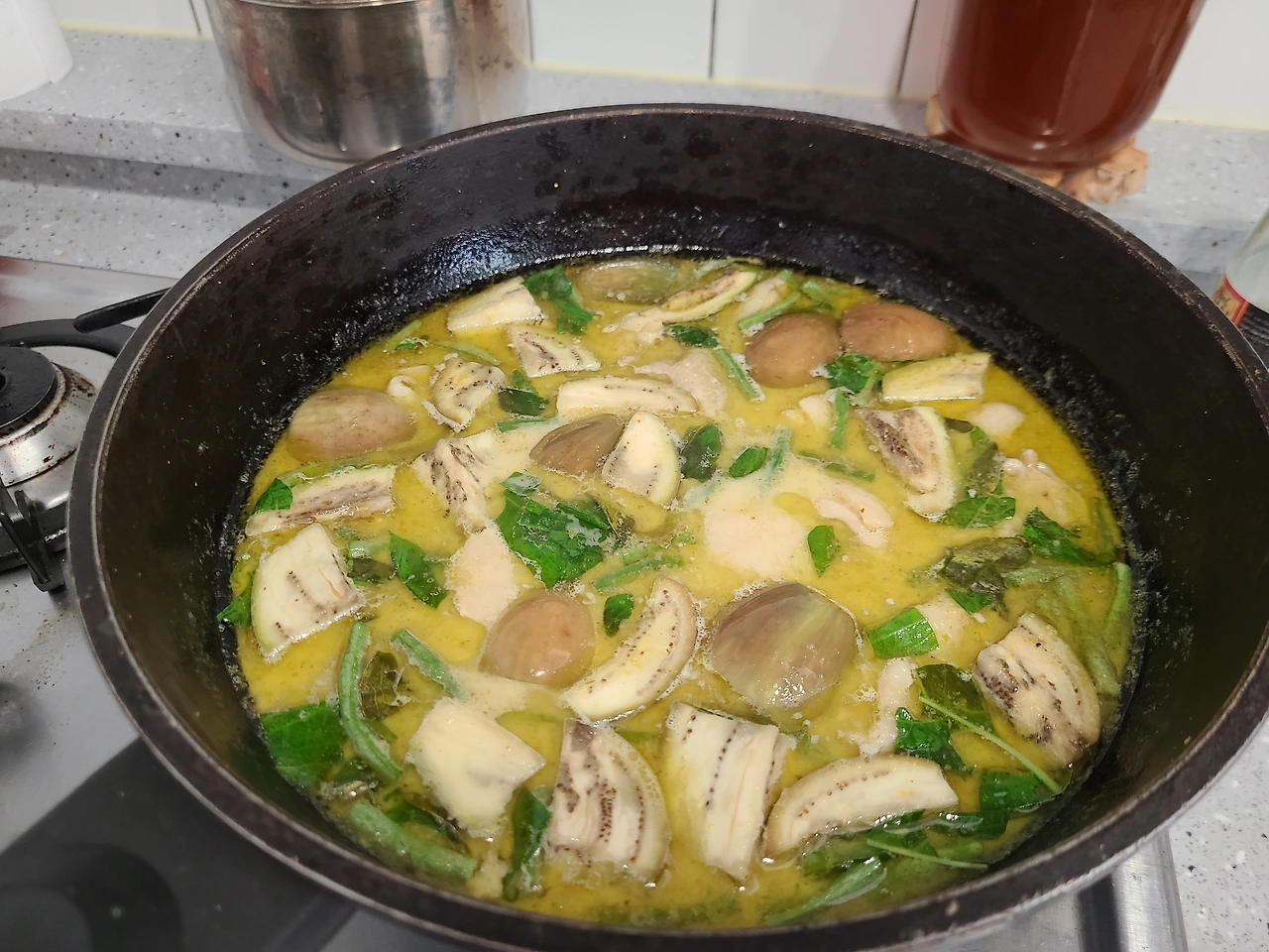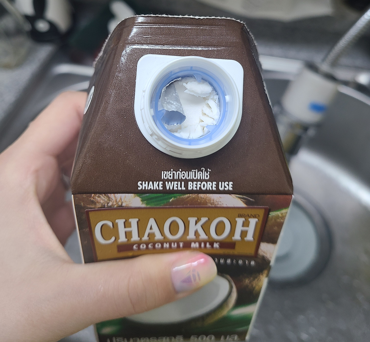 - 재료: 닭고기 140g, 커리 페이스트 4큰술(혹은 2인분 한 봉), 코코넛 크림 1컵(250ml), 코코넛 밀크 2컵(코코넛 크림 250ml+물 250ml),