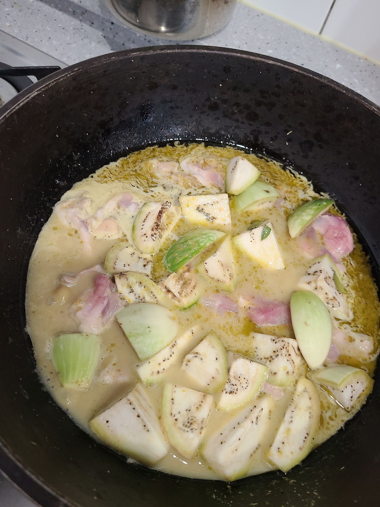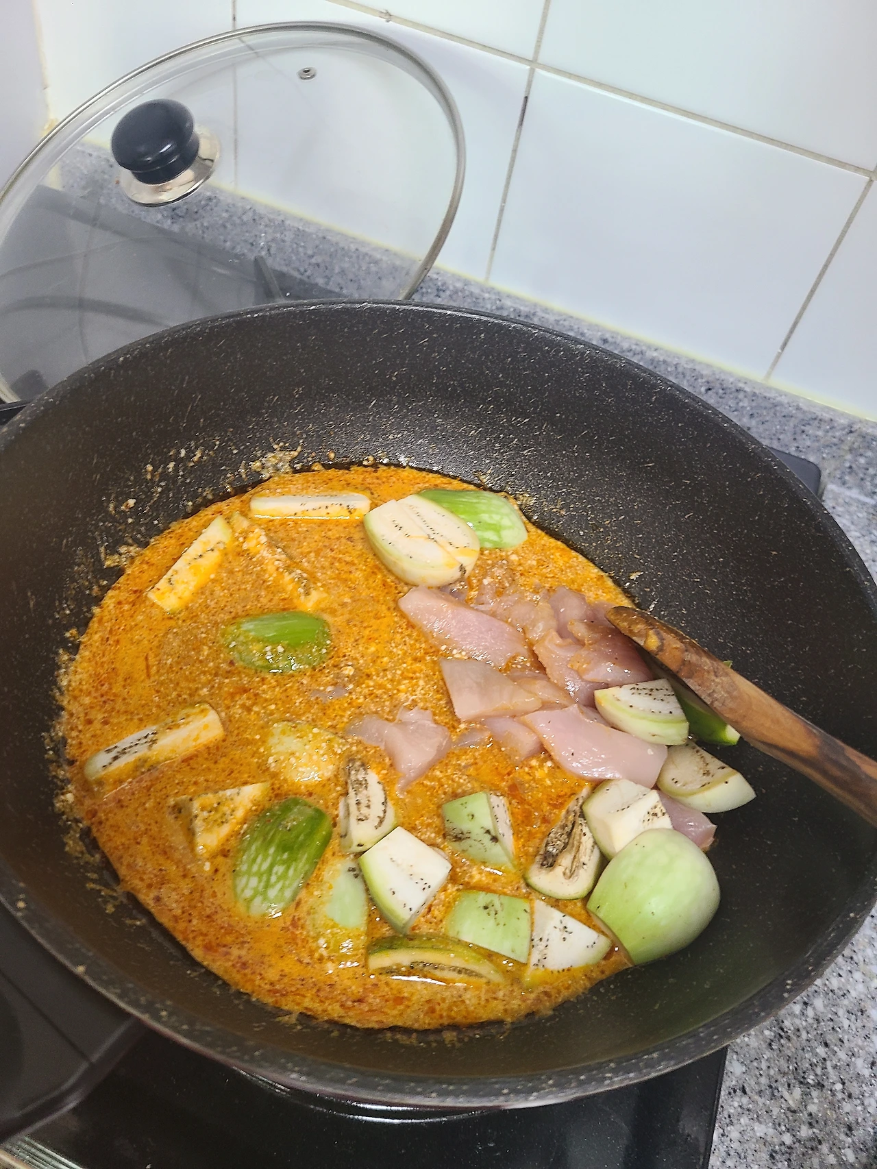 5. 닭고기가 20%정도 익으면(표면이 다 하얘지면) 코코넛 밀크를 넣고 피시소스와 팜슈가로 간을 한다.