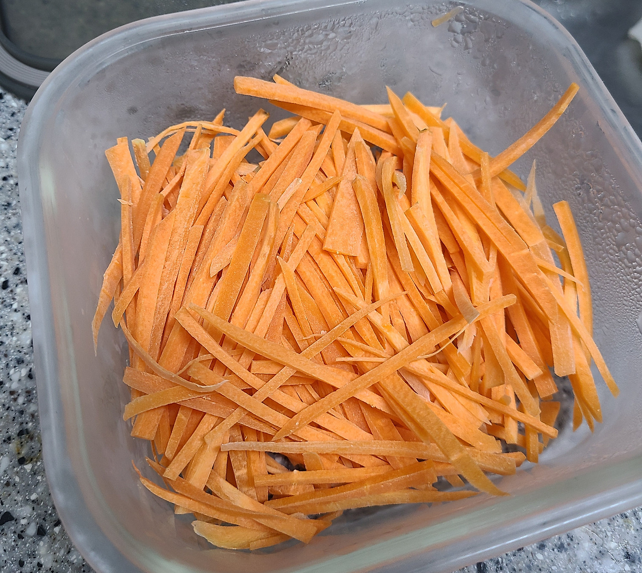 아삭, 아그작. ....? 내가 상상한 식감은 이게 아닌데. 그리고 이건 너무... 너무 당근 맛인데! 절인 시간이 부족했나 싶었지만 3일이면 하루보다 출분히 길었다. 머리에 스쳐가는 기억. 소금을 넣을 때, 언니가 새로 산 자동 그라인더를 자랑하며 이 정도면 대충 반 스푼 정도 된다고 했던 모습이 떠올랐다. 자동 그라인더가 생각보다 너무 고와서(?) 양이 얼마 되지 않았던 모양이다. 일단 뜬 당근.... 생 당근무침(?)은 먹었지만, 이대로 더 둘 수는 없어서 다시 소금을 골고루 뿌려 놓고 냉장고에 넣었다. 내가 당근 라페를 먹어본 것은 아니지만 분명 이 맛은 아닐 거다. 퇴근한 언니한테 말해 보니, 자동 그라인더에는 히말라야 핑크 솔트가 들어 있는데, 그게 일반 소금보다 더 맛이 약하기도 하다고. 어쨌든 핑계댈만한 원인을 찾아 힘을 내서 다시 방치를 시작했다.