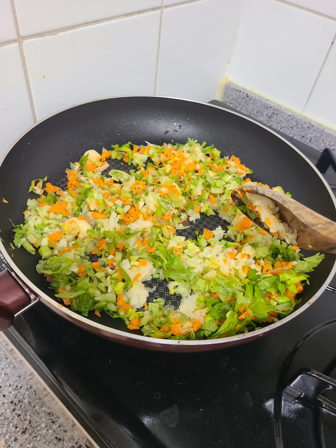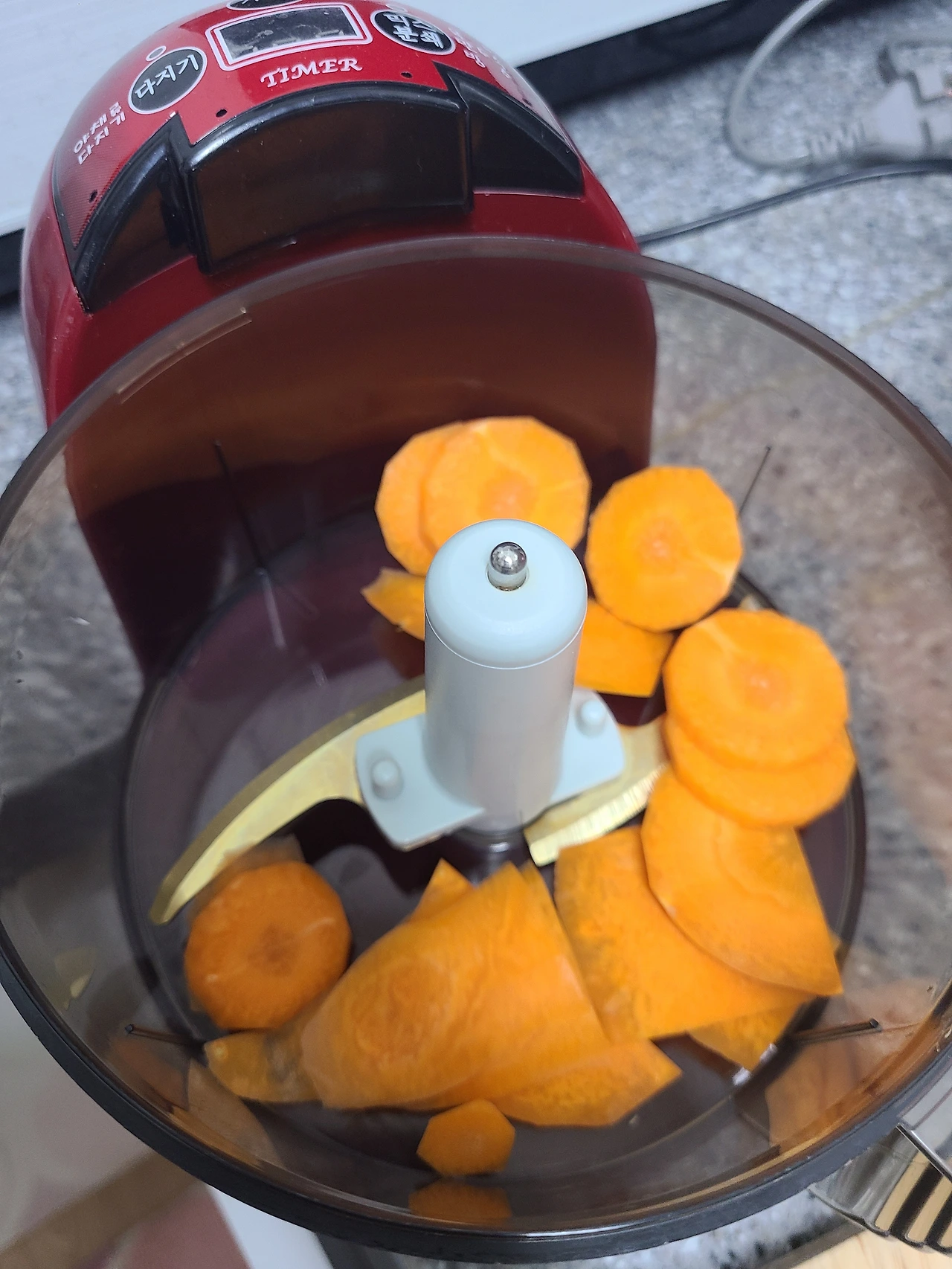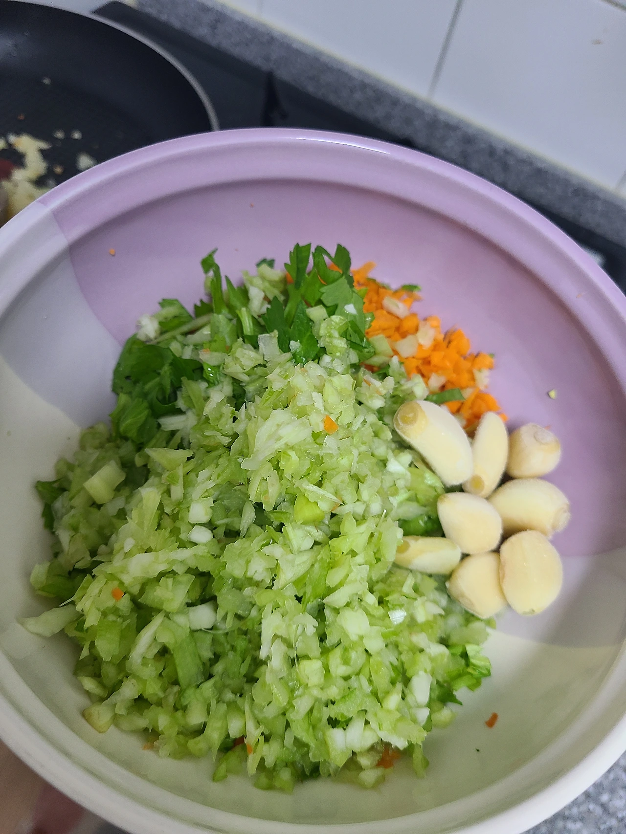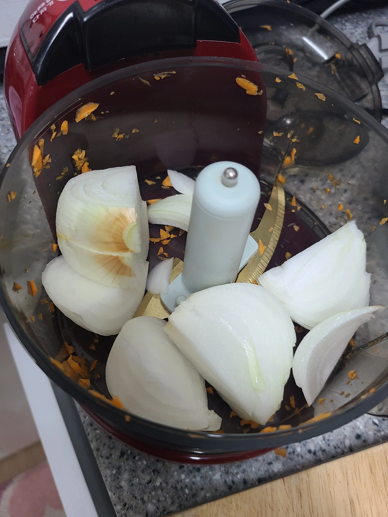 레시피는 생각보다 간단하다. 온갖 재료들을 다 다듬어서 다지기 기계로 갈고, 팬에 볶아 익힌 뒤 물을 좀 넣고 잘 졸이면 된다. 계량은... 냉장고 털기가 목적이라 딱히 열심히 하지 않았다. 모자라면 모자란 대로, 많으면 많은 대로 먹지 뭐. 당근, 샐러리, 양파 비율만 1대 1대 1에서 양파를 좀 더 쓰는 사람들이 있길래 대애충 비슷한 수준에서 양파를 조금 더하려고 했다. 마늘은 귀찮아서 다지지도 않았다. 익히면서 적당히 으깼다.