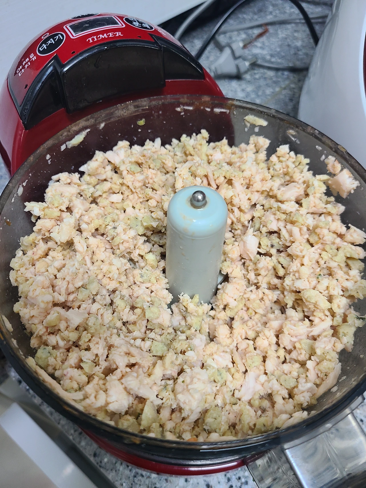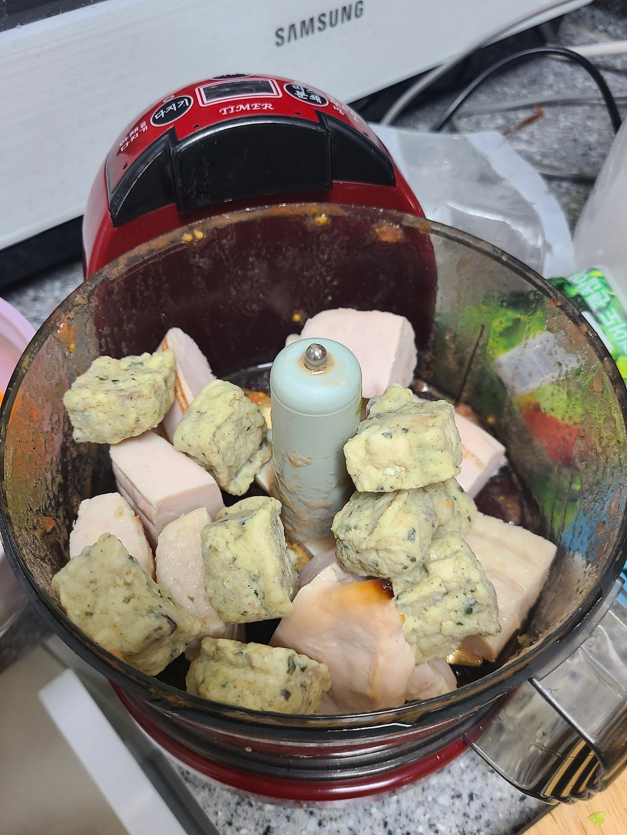 닭가슴살만 봉지에 적혀 있어서 계량을 알았다. 100g 2봉과 70g 1봉으로 총 270g! 종류도 다 달랐는데, 간이 조금 되어 있어서 부담이 적었다. 색이 다 다르지만 어차피 토마토가 들어가면 아무도 모르겠지 싶어서 무시했다. 퍽퍽한 게 싫어서 최대한 곱게 갈려고 노력했다.
