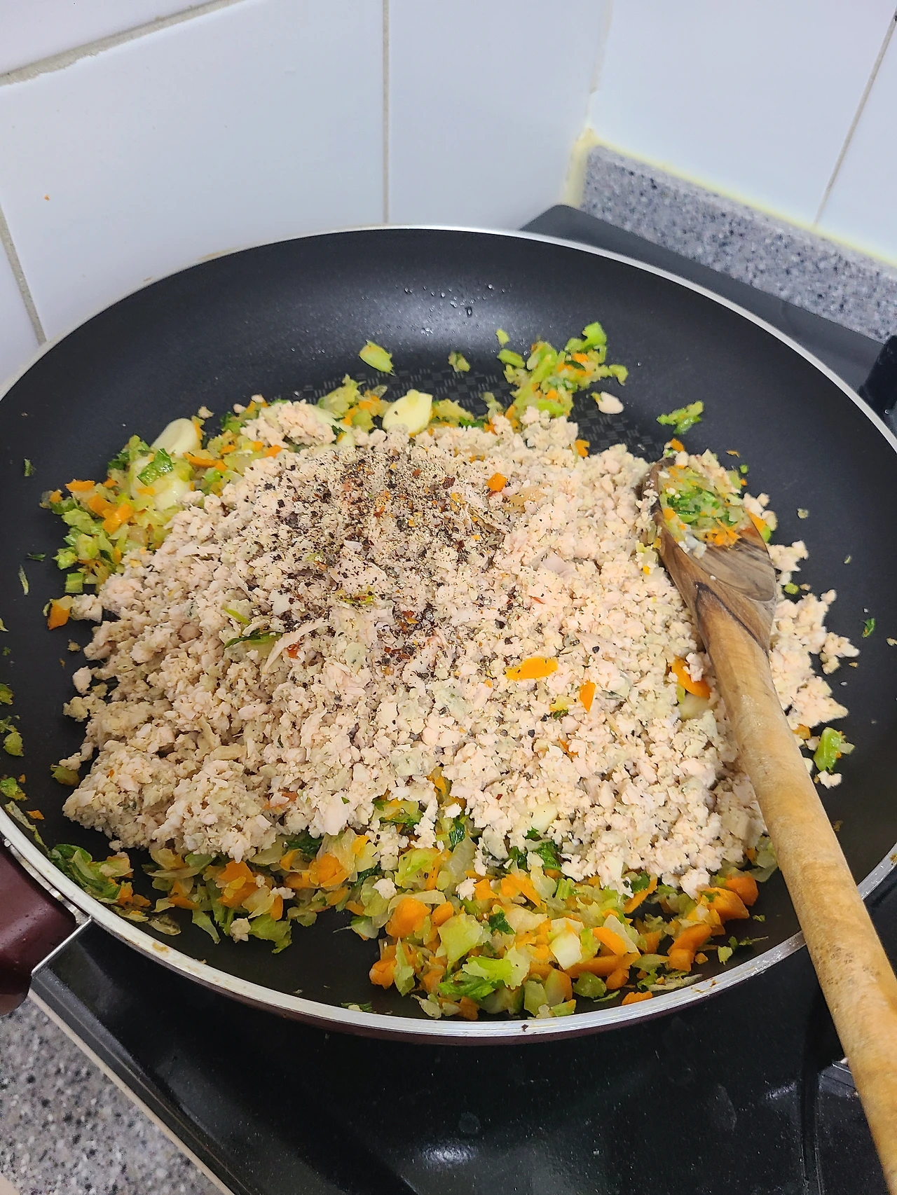 그러다 대충 당근이 익었나- 싶을 때 쯤 닭가슴살을 넣었다. 사실 당근이 익었는지는 먹어보지 않아서 모르겠지만 대충 지칠 쯤에 넣었다. 간을 좀 하라던데, 간이 되어 있는 고기라 조금만 넣고 후추를 잔뜩 넣었다. 이 상태로는 별로 볶지 않고 잘 섞어만 주었다.