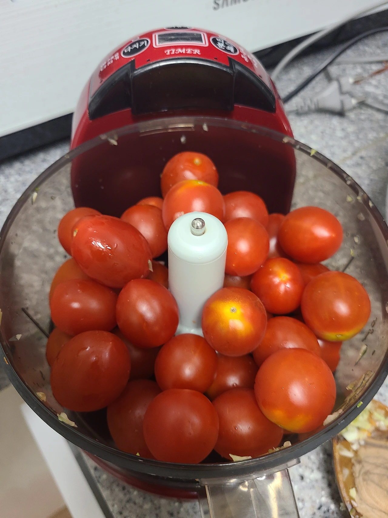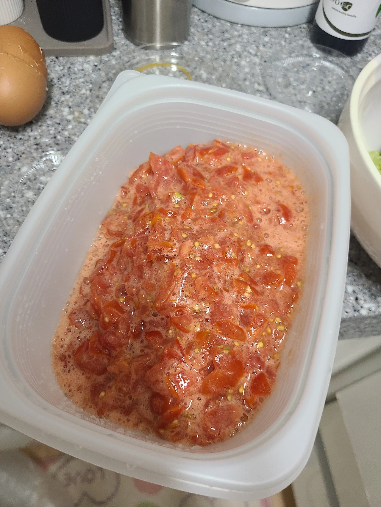 방울토마토는 더 대충 했다. 저번에는 데쳐서 껍질을 벗겼는데, 어차피 내가 먹을 거니까 패스하고 그냥 갈았다. 처음에는 1번 사진만큼만 넣어서 했는데, 막상 넣으니 적어보여서 급하게 좀 더 갈아서 추가했다.