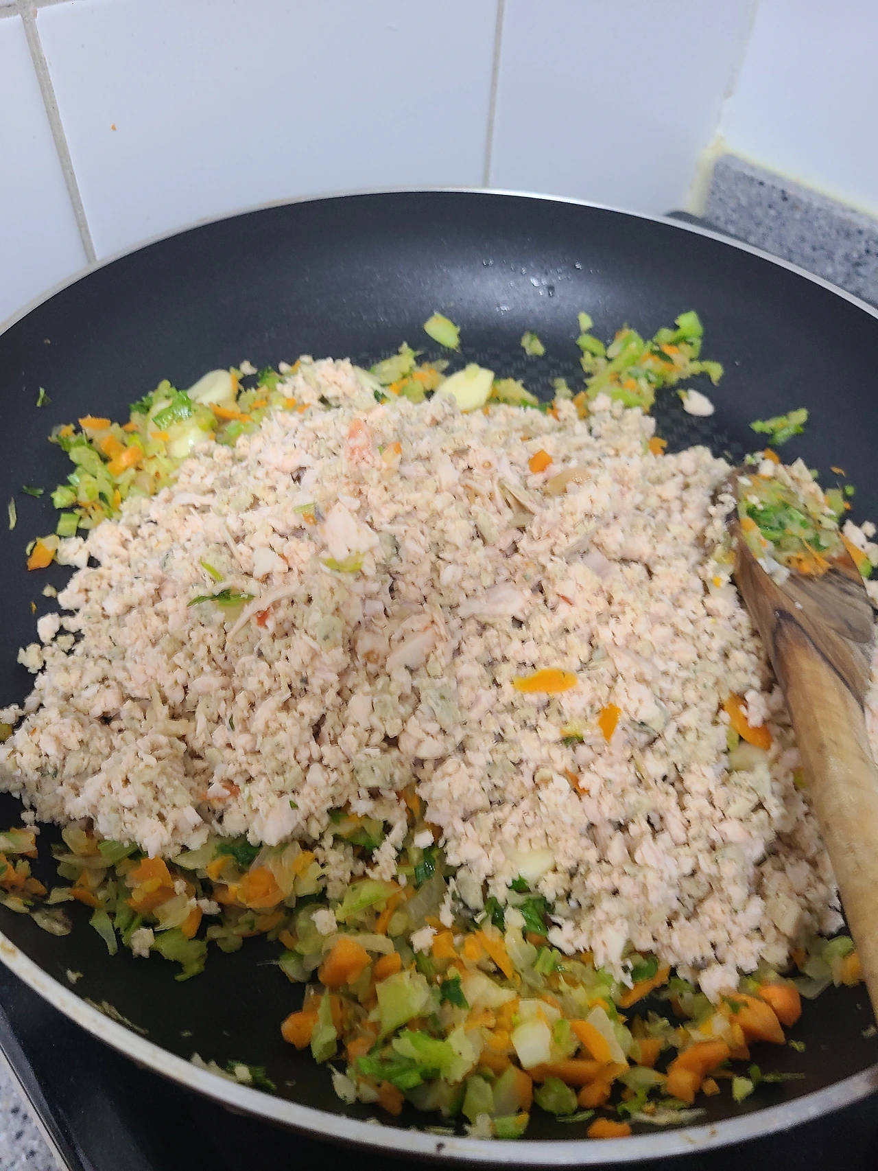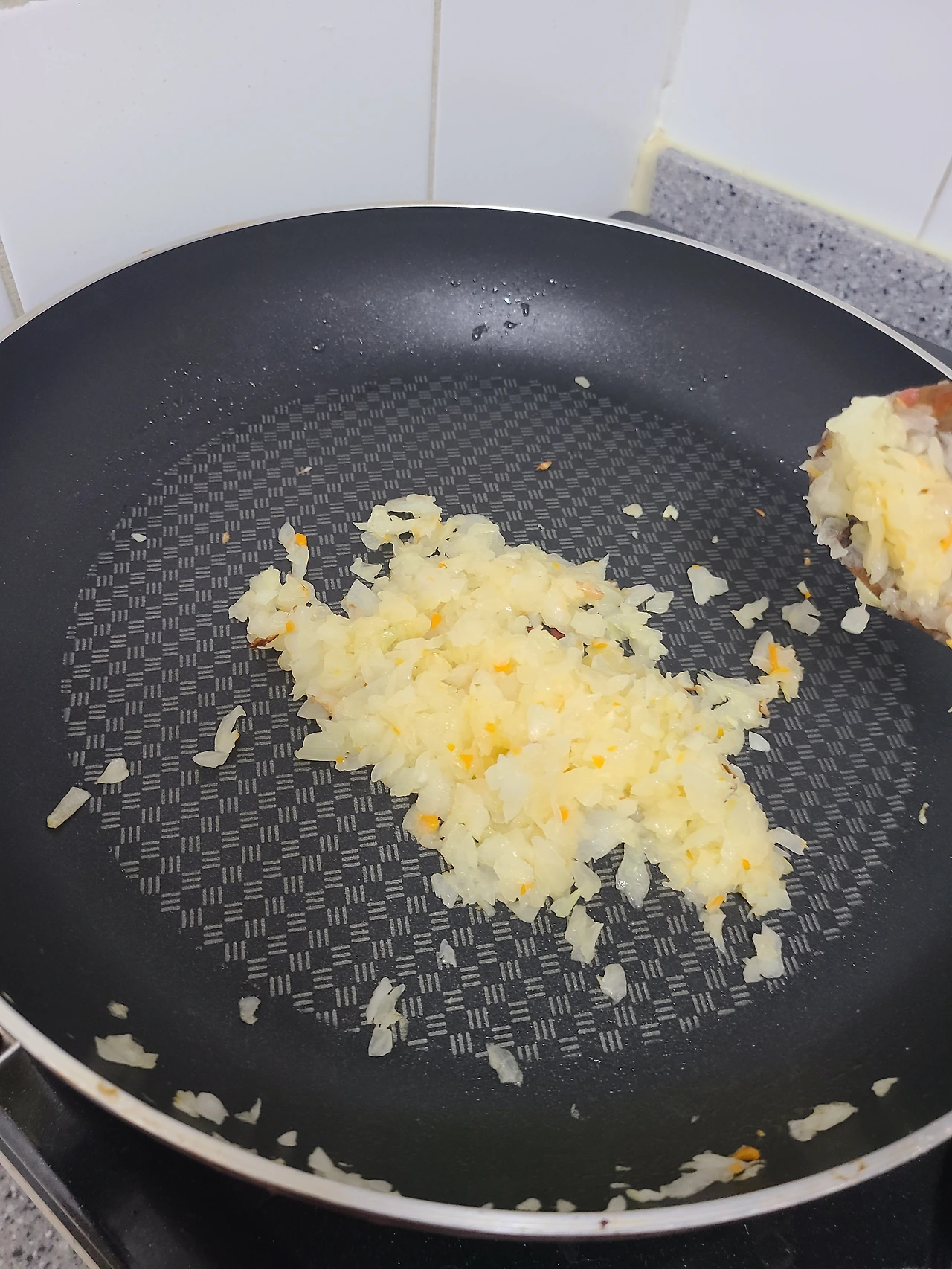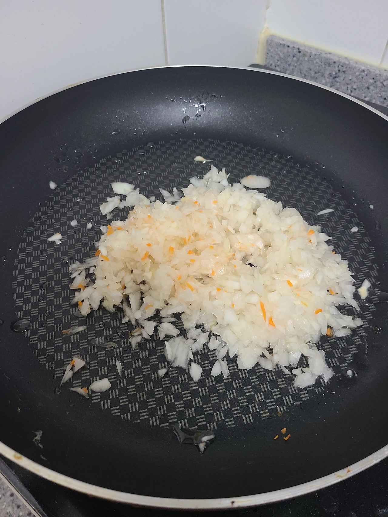닭가슴살을 갈 때쯤 양파 먼저 볶기 시작했다. 투명해질 때까지라는데, 여전히 잘 모르겠지만 아랑곳하지 않았다. 나중에 라자냐 레시피 참고하려고 보니까 그냥 야채 다 들이붓고 한 번에 볶는 사람들도 많았다. 그래도 나름 비포 애프터로 보니까 색이 꽤 변해 있다! 갈면서 조금씩 섞인 야채는 어차피 섞을 거라 무시했다. 양파가 익고 당근과 셀러리, 마늘 투하!