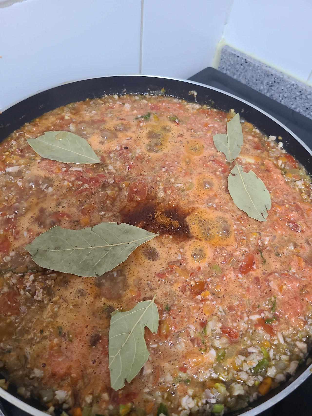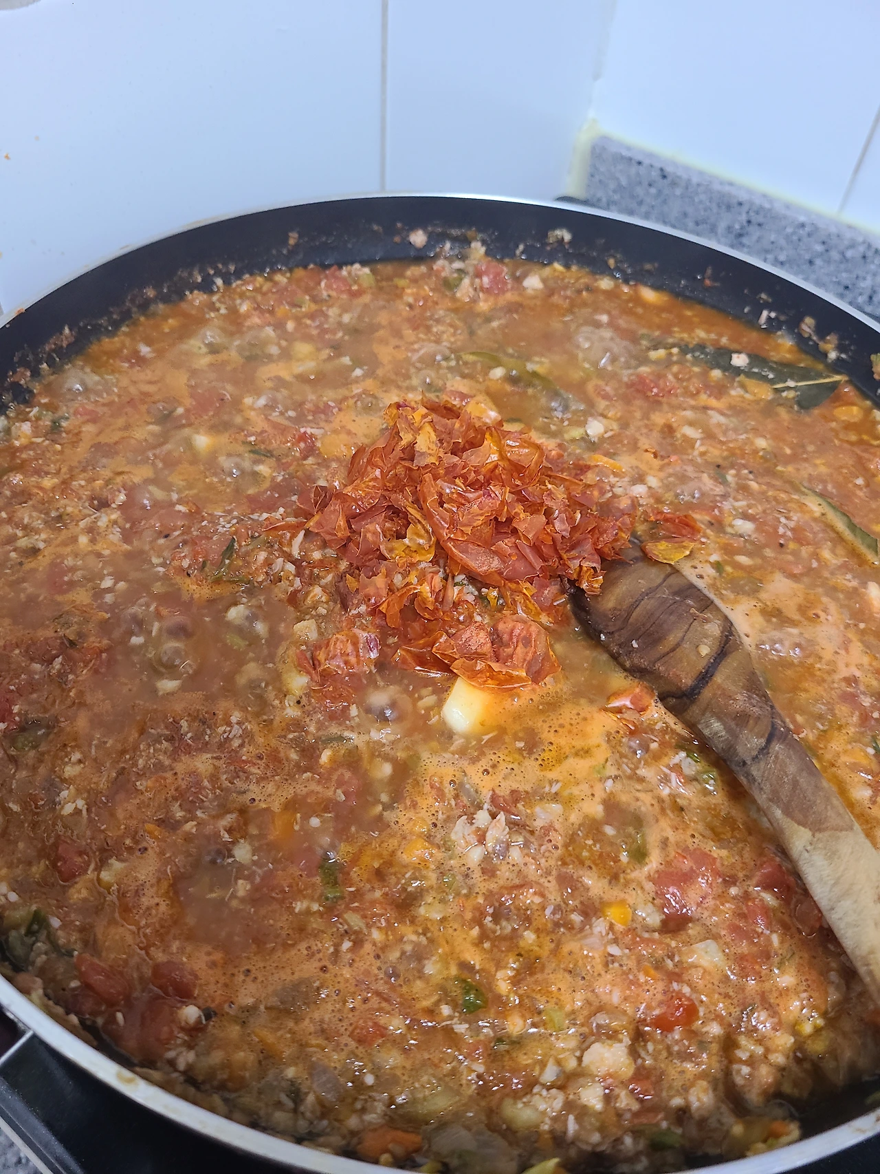 그러다 방울토마토 간 걸 넣고, 물을 대충 500ml려나-하고 넣고, 고춧가루가 없어서 케이앤페퍼 분말, 치킨스톡 2조각, 월계수잎 5장(라구를 위해 샀다), 토마토 껍질가루(껍질을 전자렌지에 7분 돌려 만들었다)를 넣고 잘 섞었다. 사진에는 없지만 고춧가루가 케이앤페퍼 분말도 좀 넣고, 친구 추천으로 산 이탈리안 시즈닝도 잔뜩 갈아 넣었다. 중간중간 간을 좀 봤는데, 다 졸기 전에 먹어 본 언니가 풍미가 부족하다고 해서 조금 주눅들었지만 뭐 한 것 없이 푸욱 1시간 반 넘게 졸여 주었더니(재료준비부터 총 2시간 걸렸다) 없던 풍미가 생겼다.