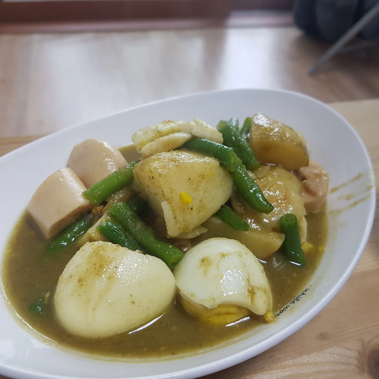 저번에 그린커리 파스타를 만들기 전 먼저 했던 그린커리. 회사표 재료인 닭가슴살 소시지와 삶은 계란, 감자릉 대충 숭숭 넣었다. 참고한 레시피는 오른쪽.