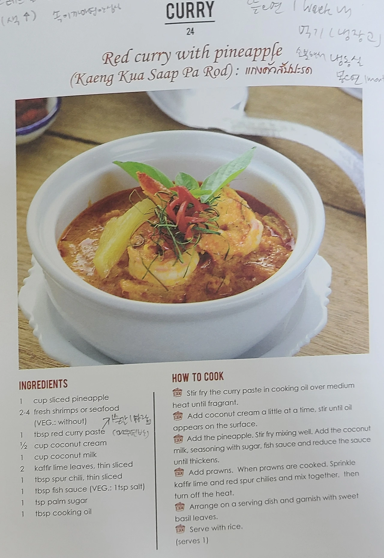오 이건 이름.. 읽기 어렵다. 보통 커리 이름은 깽끼우완이랑 깽펫 정도만 외웠어서, 어색하다. 쌉파랍이 파인애플일까? 파인애플 볶음밥도 약간 저런 이름이었던 것 같다. 재료가 비슷한 듯 다르다. 아점을 챙겨먹고 검사가 음성이 떠서 다시 출근했고, 마침 파인애플이 회사에 나오길래 테이크아웃을 해 왔다. 오는 길에 쌀도 사 왔다. 냉동실에 굴러다니던 새우까지 대충 해서 도전! 백신을 맞아서, 든든하게 챙겨 먹겠다고 했다. 사실 레드커리 페이스트가 4인분인데, 필기에 뜯으면 일주일 이내로 먹으라고 되어 있어서 일주일 내 2번을 더 먹어야 했다ㅋㅋㅋㅋ