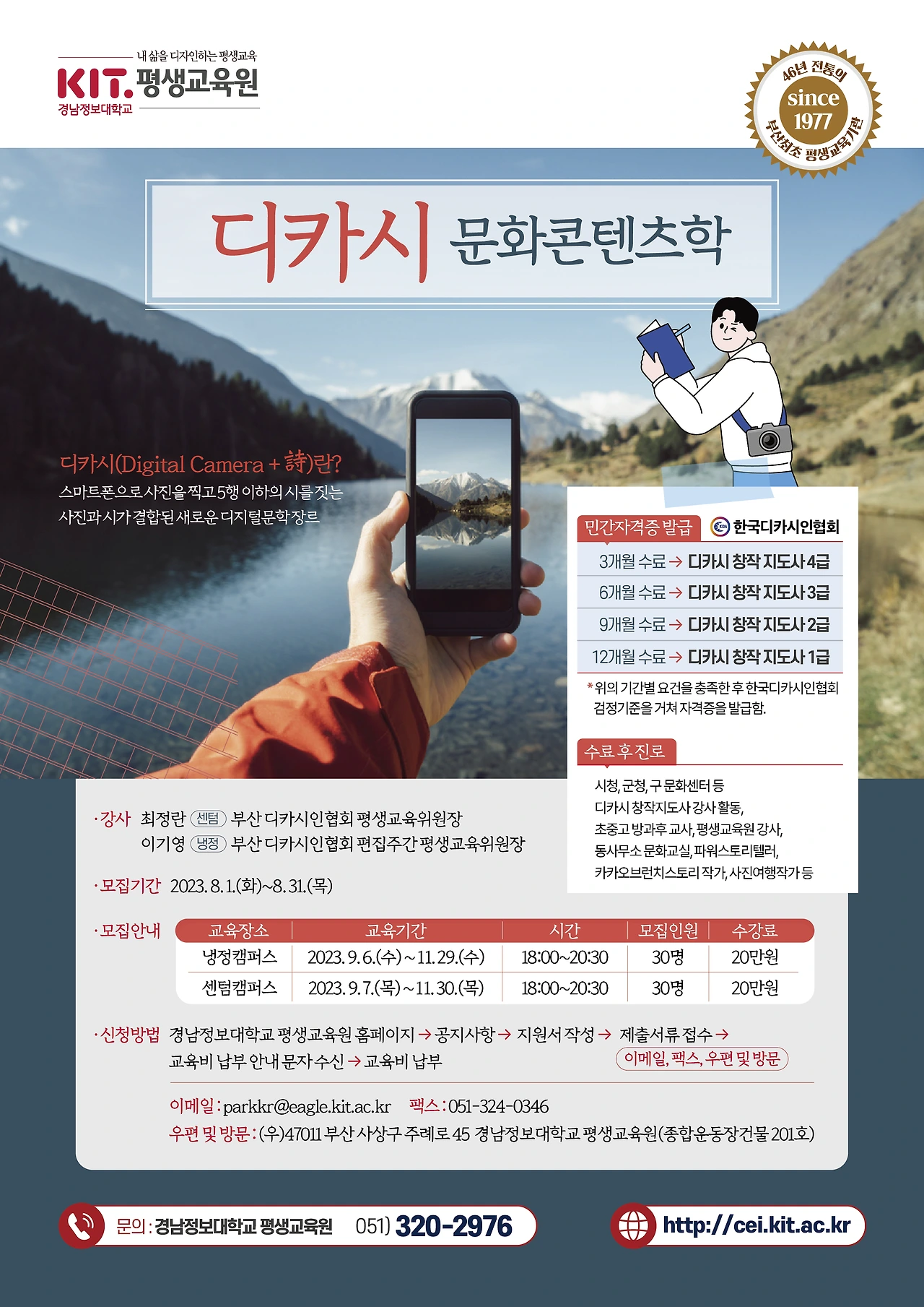 경남정보대 평생교육원 냉정 캠퍼스와 센텀 캠퍼스 두 곳에서 훌륭한 강사진으로 구성된 디카시 아카데미가 9월 초에 열린다.