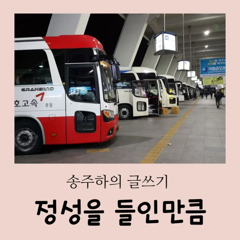 고속버스 프리미엄을 타기로 했습니다. 총 네시간이 걸립니다. 중간에 휴게소에 잠시 쉬어갑니다. 그때 화장실에도 가고, 간단한 간식을 사먹기도 합니다. 자리가 편해서 일까요. 잠이 잘 옵니다. 휴게소에 도착했을 때 깼는데, 완전 푹 잔 기분이 들었습니다.