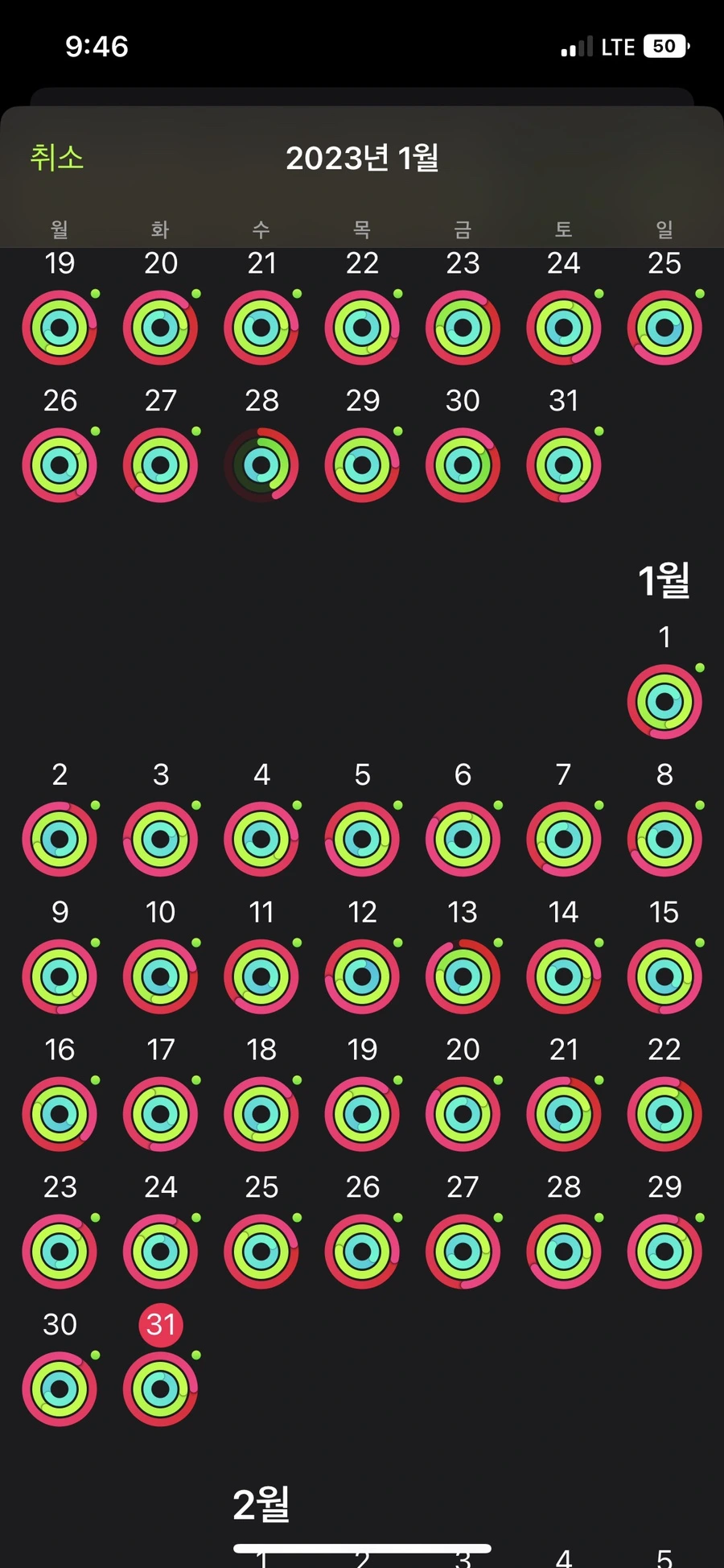 3) 운동의 즐거움을 더욱 깨닫고, 하루 빼고 운동량을 다 채운 날들